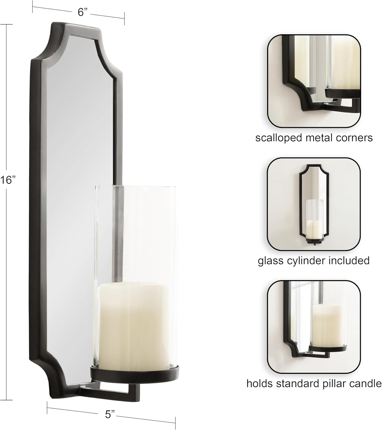 Kate and Laurel Ciel Glam Mirrored Wall Sconce, 6 x 5 x 16, Black, Modern Scalloped Candle Holder with Removable Glass Cylinder and Mirror for Bathroom or Bedroom Wall Decor