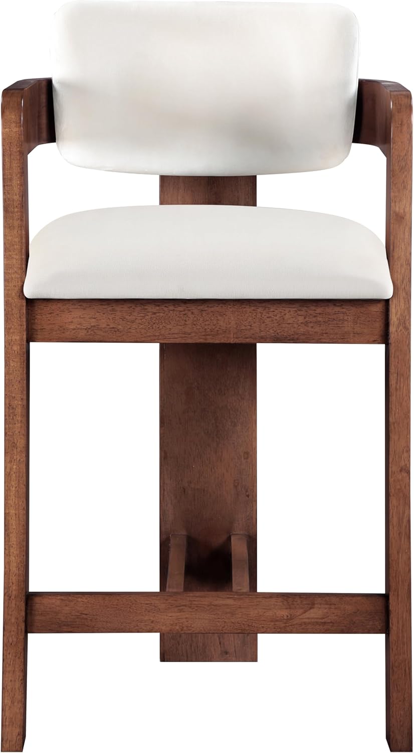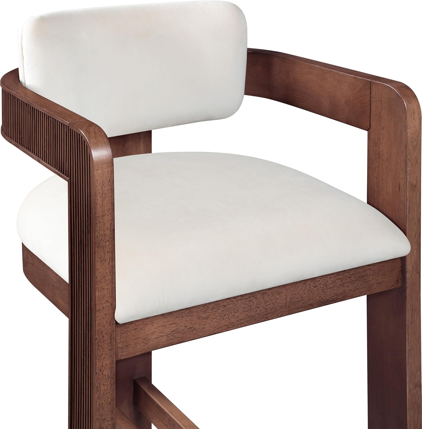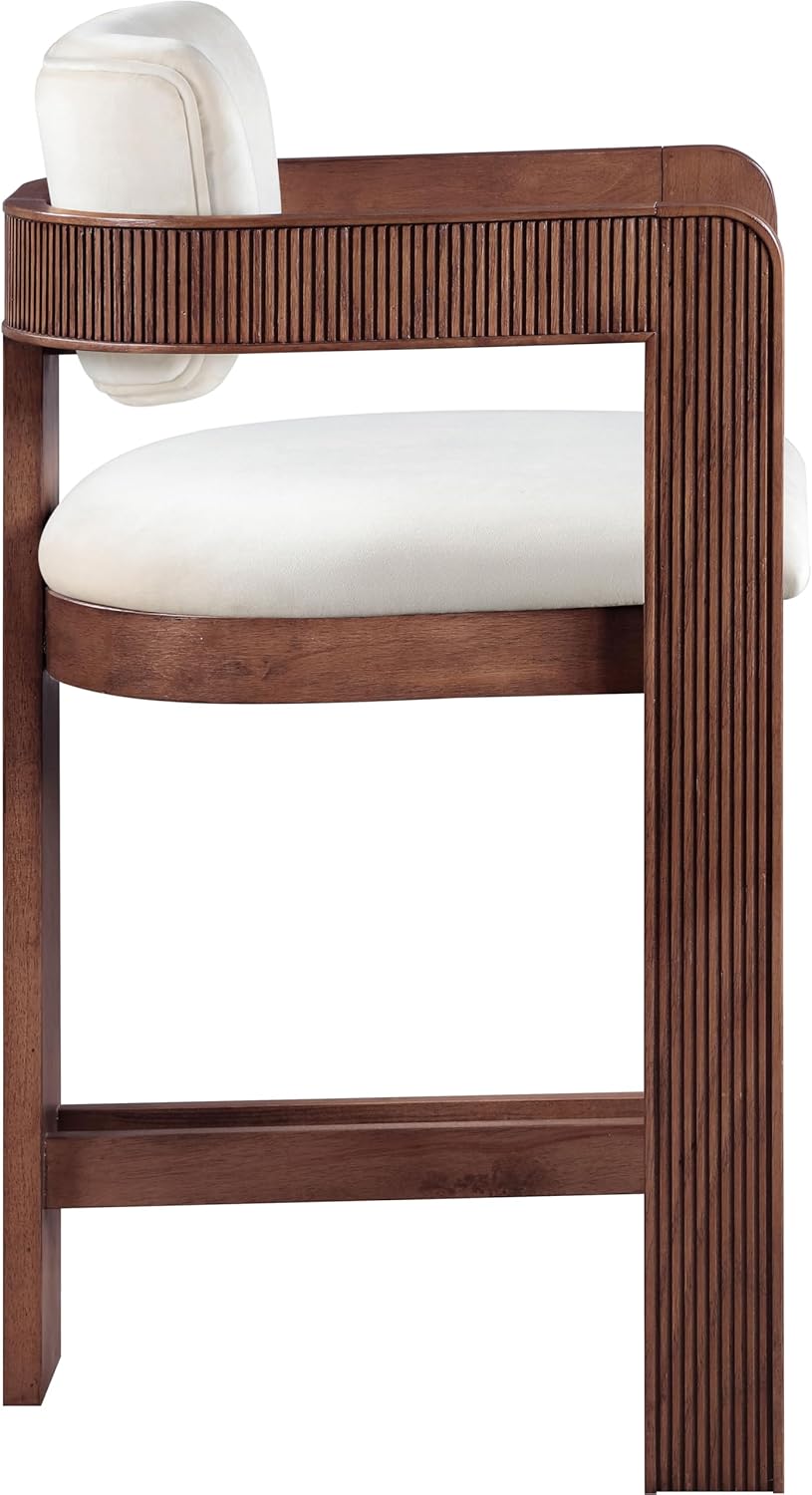 Elevate your counter seating with the Sacha cream velvet upholstered counter stool, a perfect blend of refined texture and timeless craftsmanship. Wrapped in a soft, striking 460 GSM velvet, this stool offers both depth and sophistication. The solid wood frame, finished in a brown walnut tone, showcases elegant fluted detailing, adding a touch of classic artistry.