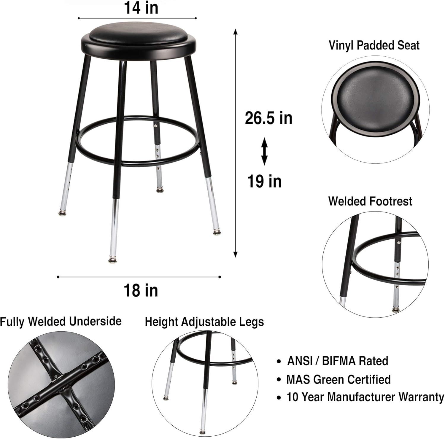 【 OEF Furnishings Premium Commercial Stools 】OEF commercial stools provide a unified solution wherever durable seating is needed. Each stool starts with a heavy duty steel frame and integrated foot ring that feels solid underfoot, whether used as a lab stool, classroom stool, shop stool, garage stool, or utility stool. Round and square tops in hardwearing Masonite or easy to clean vinyl create a consistent look across labs, makerspaces, workshops, and training areas, while optional backrests add support for longer sessions at the bench or counter. Heights span classic school standards and counter applications, covering student desk height, counter height seating, and bar height work surfaces. Fixed models serve as reliable school stools and lab stools, while adjustable height stool options bridge between short kitchen stools, counter height stools, and tall bar stools without sacrificing stability. Facilities can standardize with a single commercial stool family instead of juggling random kitchen stools and decorative bar stools that cannot handle daily institutional use. The compact footprint fits under tables and along workbenches where space is tight, creating tidy rows of counter stools in science labs, STEM rooms, and shop classrooms. In front office and service areas, the same steel frame stool functions as an office chair stool, reception stool, or breakroom stool for shared counters and café style tables. For maintenance and trade programs, the design doubles as a rugged workshop stool, workbench stool, or garage shop stool that resists flex and wobble. All models share sturdy steel frame construction with a secure foot ring design that supports comfortable posture. The result is a family of commercial bar stools and classroom furniture stools that works from kitchen island seating and coffee bar counters to demanding lab furniture layouts and vocational shops, giving planners one proven all purpose stool platform for long term use.