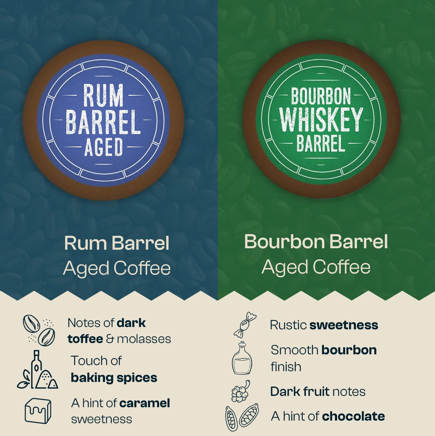 | Variety | Four assorted coffee beans infused with Bourbon, Malt Whiskey, Rye Whiskey, and Rum from Colombia, Sumatra, Ethiopia, and Rwanda |