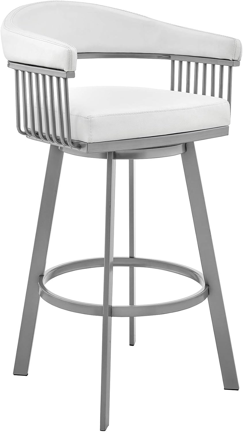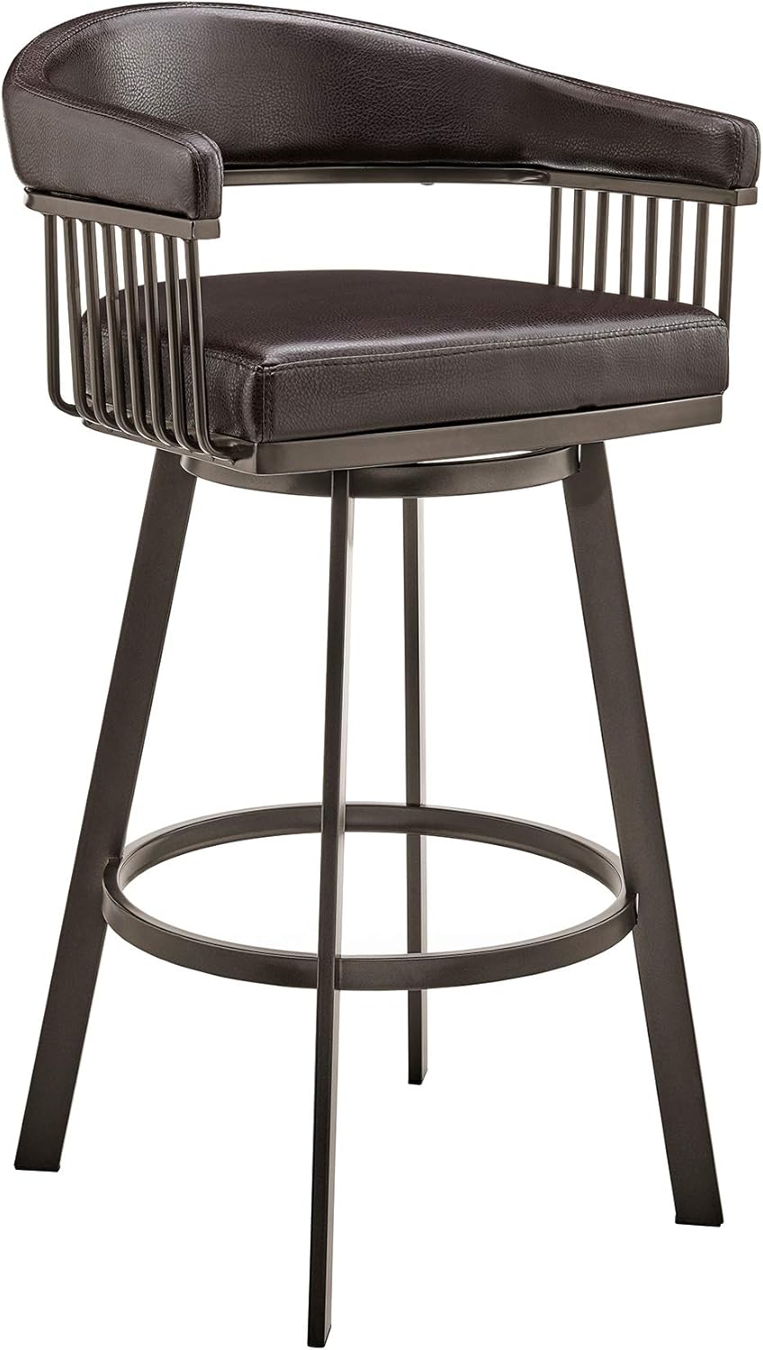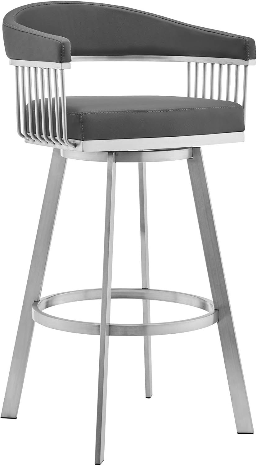 Bring the Chelsea Swivel Bar Stool from Armen Living into your beautiful home! It is the best choice to bring in another seating option and does so without compromising on comfortability. The wonderful faux leather and metal accents give the Chelsea a look of refinement, making you proud to show it off in your home. The foam-padded seat cushion offers you the most comfort available to you! This curved open-back stool will keep you relaxed while enjoying dinner with your friends and family. The Chelsea also features a convenient metal footrest, for additional support and stability. The Chelsea comes in a variety of color and finishes; black, gray, and white faux leather with brushed stainless-steel finish, black or vintage gray faux leather with black finish, chocolate faux leather and java finish, and white faux leather with silver finish. All color options are available in your choice of 26” counter height and 30” bar height.