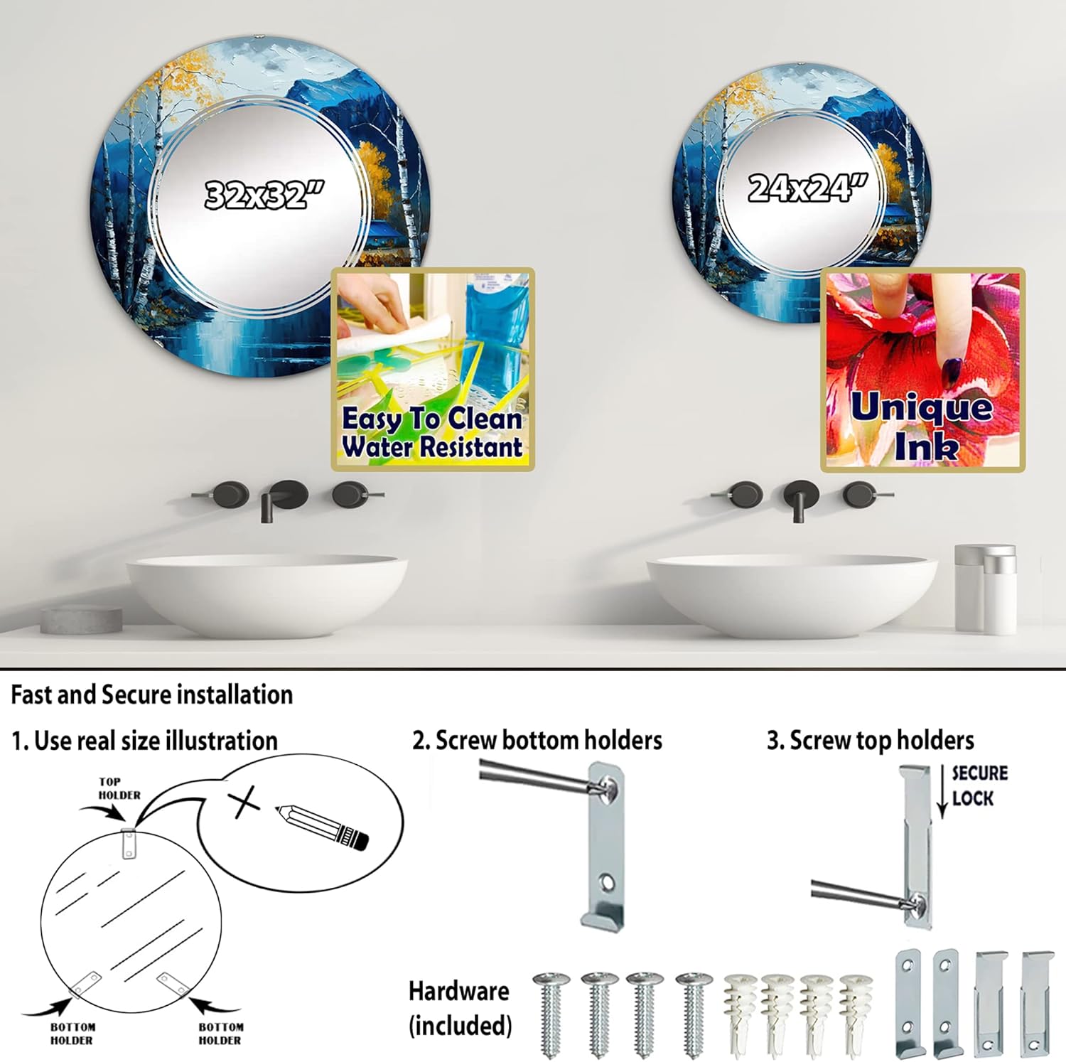 Display this beautiful wall mirror over your sofa or your bathroom vanity for an elegant touch. In an industry that has seen very little innovation over the years, DesignQ proudly brings you our exclusive collection of wall mirrors with printed designs. Mirrors, a staple decor item in every home have now become more than just a mirror, they have become piece of art. All of our wall mirrors are carefully inspected prior to shipping and packaged securely with several layers of protective packaging, ensuring a safe delivery. Every mirror arrives ready to hang on the wall with drywall anchors and screws. Round Mirror Measurements In Inches: -24" x 24" -32" x 32" -36" x 36"