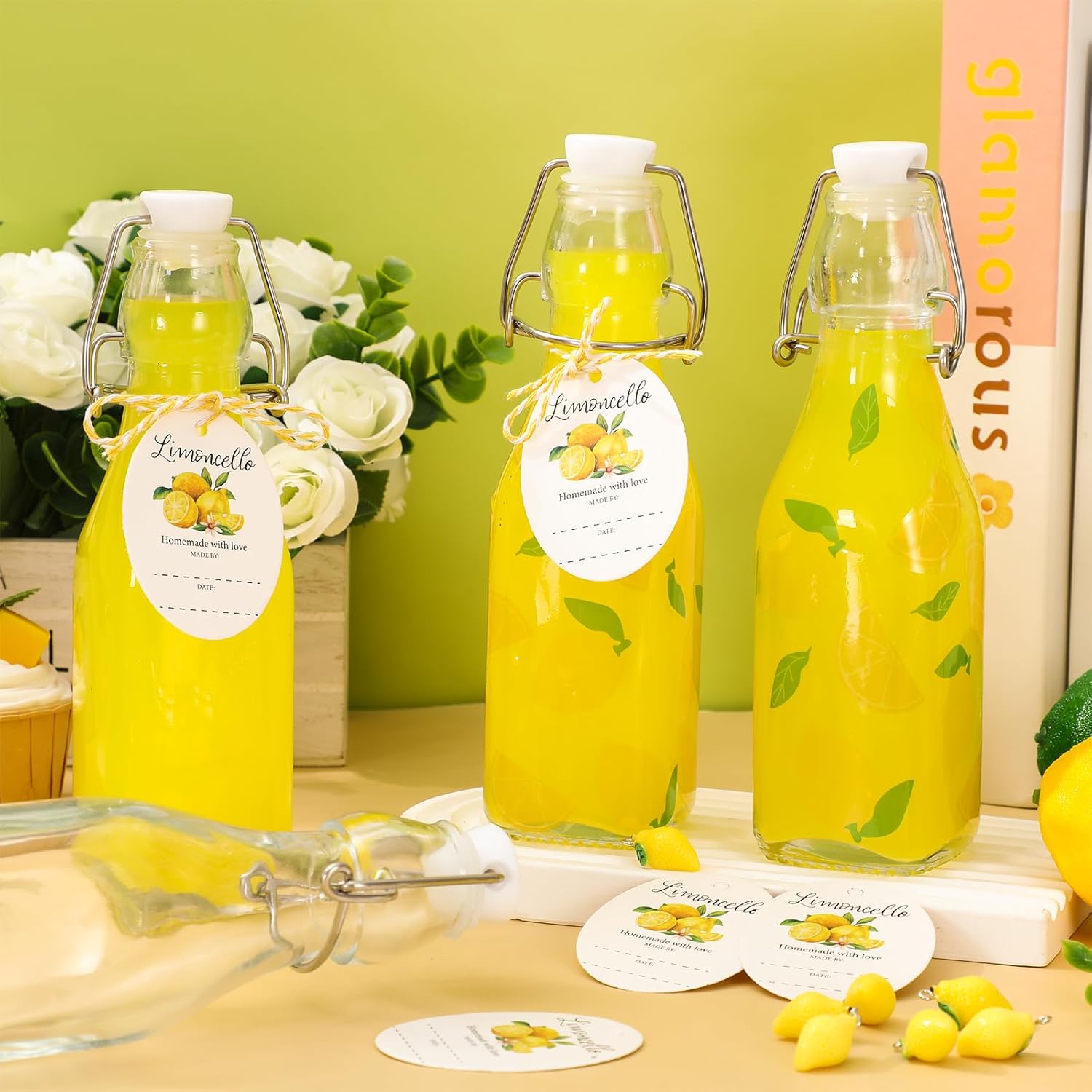 Features: Sufficient Quantity: 20 set lemon swing top glass are contained in the set, safe and sturdy, wonderful essentials for your parties and kitchen. Widely Used: Made of premium silicone and glass material, they are sturdy and exquisite with refined workmanship, can be used for baby shower, birthday, wedding, summer parties and so on. Specifications: Material: glass, silicone Size: 8 oz Package includes: 20 x Glass Bottle with Stopper 20 x Sticker 20 x Label Tag with Twine 20 x Lemon Charm