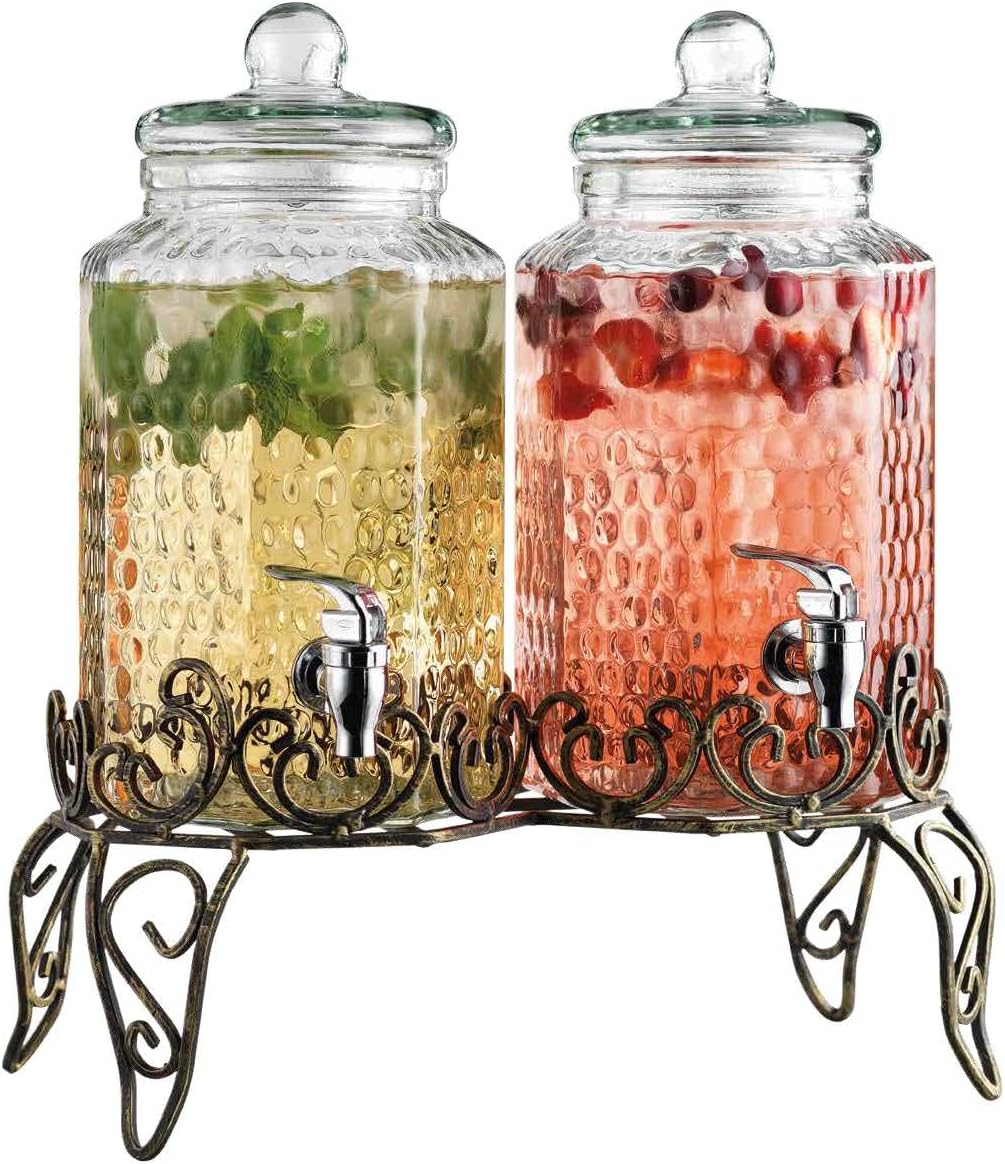 Create a beautiful drink station with the Glass Beverage Dispenser Set of 2 with Elegant Metal Stand. Each dispenser holds 1 gallon, giving you plenty of capacity to serve refreshing drinks to guests at parties and events. The hammered glass design adds a decorative and elegant look while remaining strong and durable for everyday use. Whether you are serving lemonade, iced tea, infused water, juice, punch, or cocktails, these dispensers provide both style and convenience. Each dispenser includes a smooth leak-proof spigot for easy pouring and a metal lid that helps keep beverages protected while serving. The elegant elevated stand raises the dispensers for comfortable pouring and creates a stylish centerpiece for your drink station. Perfect for: Parties Weddings BBQs Holiday gatherings Baby showers Catering events Everyday drink stations Serve drinks in style with this beautiful hammered glass beverage dispenser set designed for both functionality and elegant presentation.