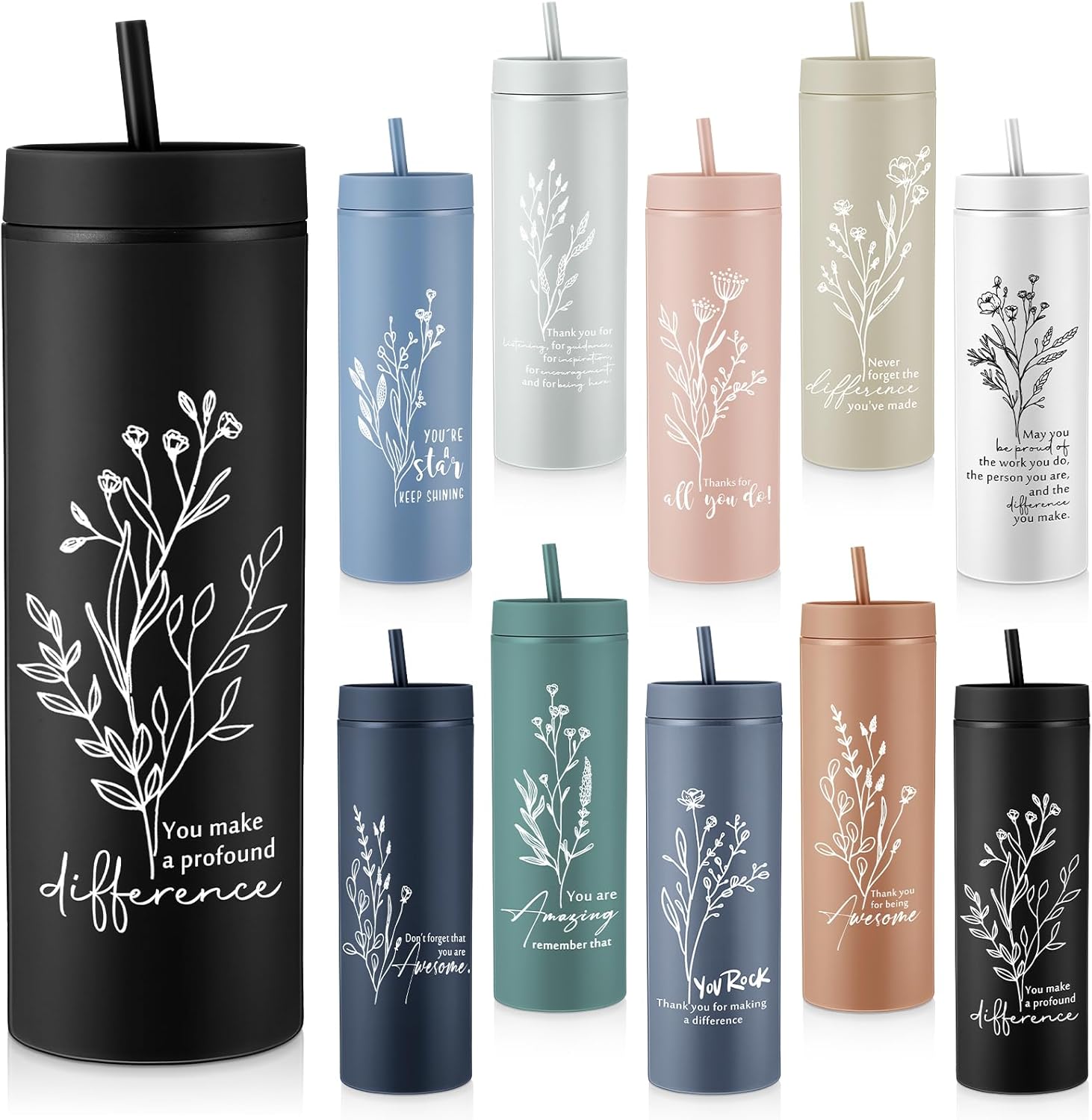 | Included Components | 10 x Inspirational matte tumblers with lids and straws, quotes |