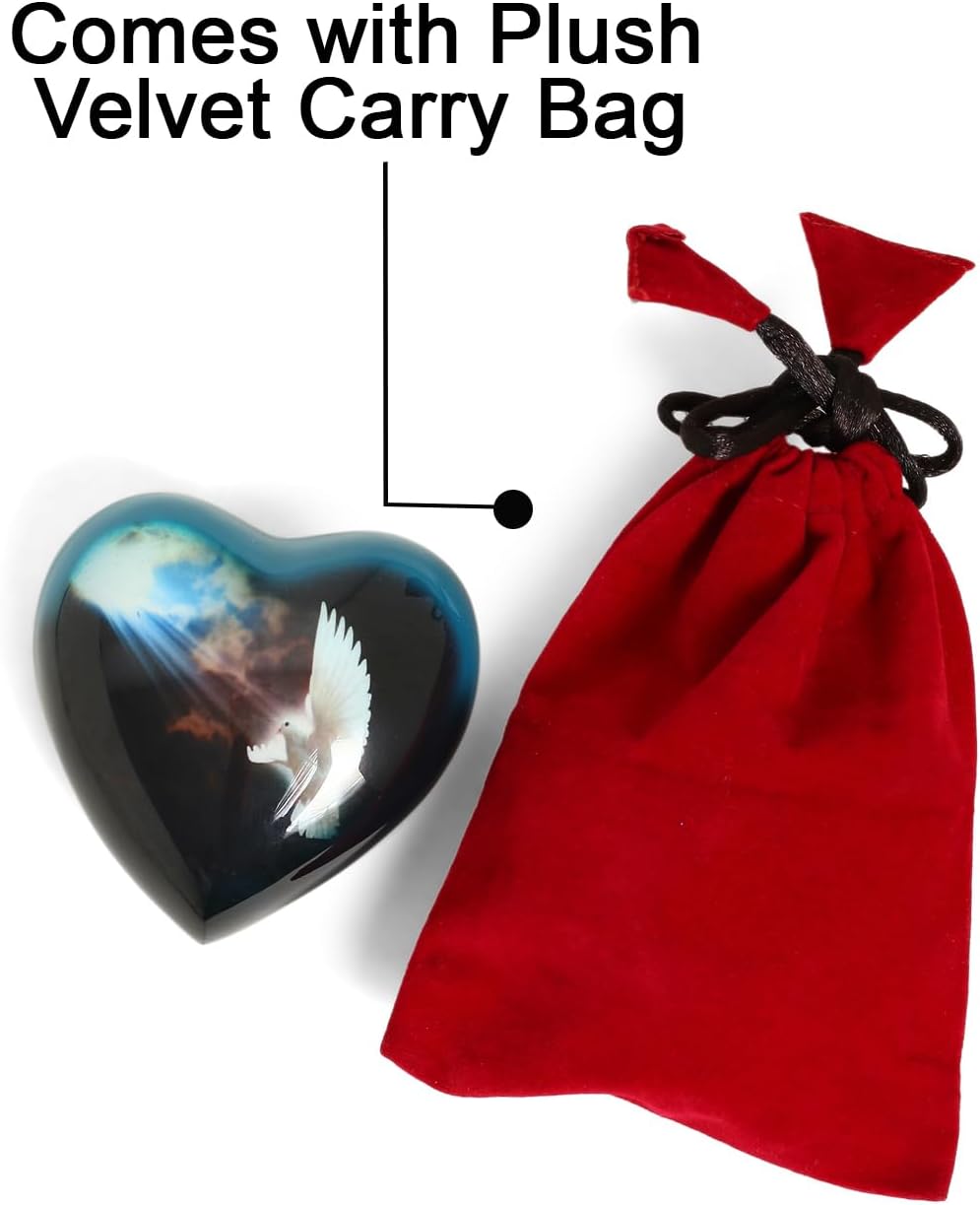 THE ASCENT MEMORIALS White Dove of Peace Heart Urns for Human Remains Ashes is having adorable quality and affordable cost for every individual. Share the memories of your loved ones amongst your family and friends. The Small Love Heart urns are purely Hand-Crafted items and are made of Solid Metal using ancient “Sand Cast” technique. There are one White Dove painted Love Heart urn, one Silver Polished Display Stand, One Drawstring Velvet Carry Bag and one Paper Funnel to pour Ashes inside the urn. Small Heart Urn is painted perfectly and costed with transparent enamel to make it Scratch proof.♥ OVERALL FINISH AND COLOR: The Funeral Mini sized Love Heart Urn is made of Solid Aluminum Metal using Sand Cast Technique. The Front side of Heart is Painted with Natural Full Moon Scenery by experienced artisans. The Back of the Memorial Miniature Heart Urns is secured with Threaded Lid to protect ashes inside the urn for life time.♥ DISPLAY STAND: There is a Silver Polished Display Stand in the Sales Kit. To keep the beautiful Heart Urn on. Proudly showcase your loved ones remain Ashes Urn on it.♥ VELVET CARRY BAG: There is Drawstring Velvet Carry Bag inside the sales kit to hold and carry Heart Keepsake Cremation Urns.♥ PAPER FUNNEL: There is Paper Funnel inside the sales kit which helps to pour the Ashes inside the urn conveniently and easily.♥ SCRATCH PROOF COLOUR: The outer layer of the Heart Urn is coated with transparent enamel and thus the urn’s painting is scratch proof and long lasting.♥ SCREW THREADED LID: The backside is secured with a threaded Lid which provides additional safety to the ashes inside the urn.♥ INCLUDED COMPONENT: • SMALL HEART URN FOR ASHES - 1 PIECE • SILVER DISPLAY STAND - 1 PIECE • VELVET CARRY BAG - 1 PIECE • PAPER FUNNEL - 1 PIECE • STUNNING GIFT BOX - 1 PIECE