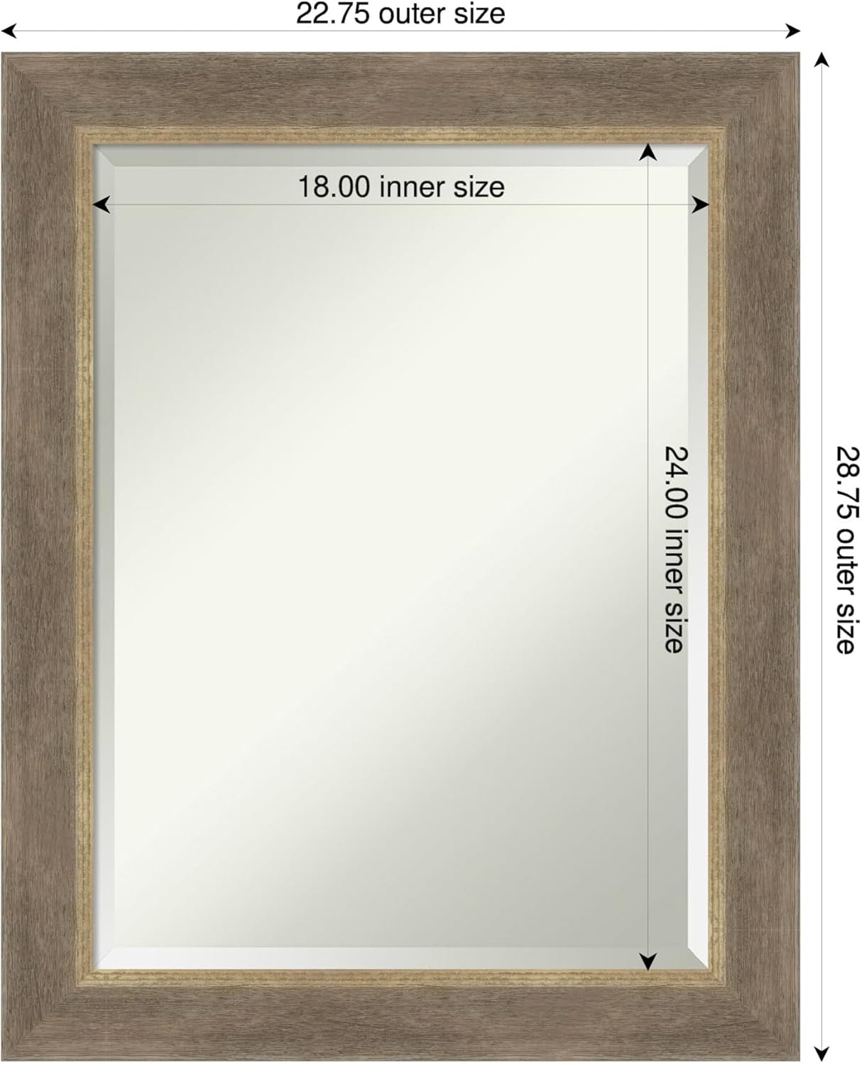 PRODUCT: Amanti Art Beveled Wood Bathroom Wall Mirror; OUTER SIZE: Exactly 22.75 x 28.75 inches; FRAME: Driftwood Tan; FRAME FINISH: Matte; FRAME COLOR: Brown. The Driftwood Tan frame is a matte finish, softly scooped tan and grey frame with wood grain pattern and a mottled champagne stepped inner edge. Give your bathroom the finishing touch with this 100% real wood-framed wall mirror. Individually made using traditional custom framing techniques, it has the quality you would expect from your local frame shop. It holds its value with premium finishing that can be appreciated up close. Because of our attention to detail and focus on artistry, architects, interior designers, and homeowners alike choose this mirror to create beautiful living spaces.