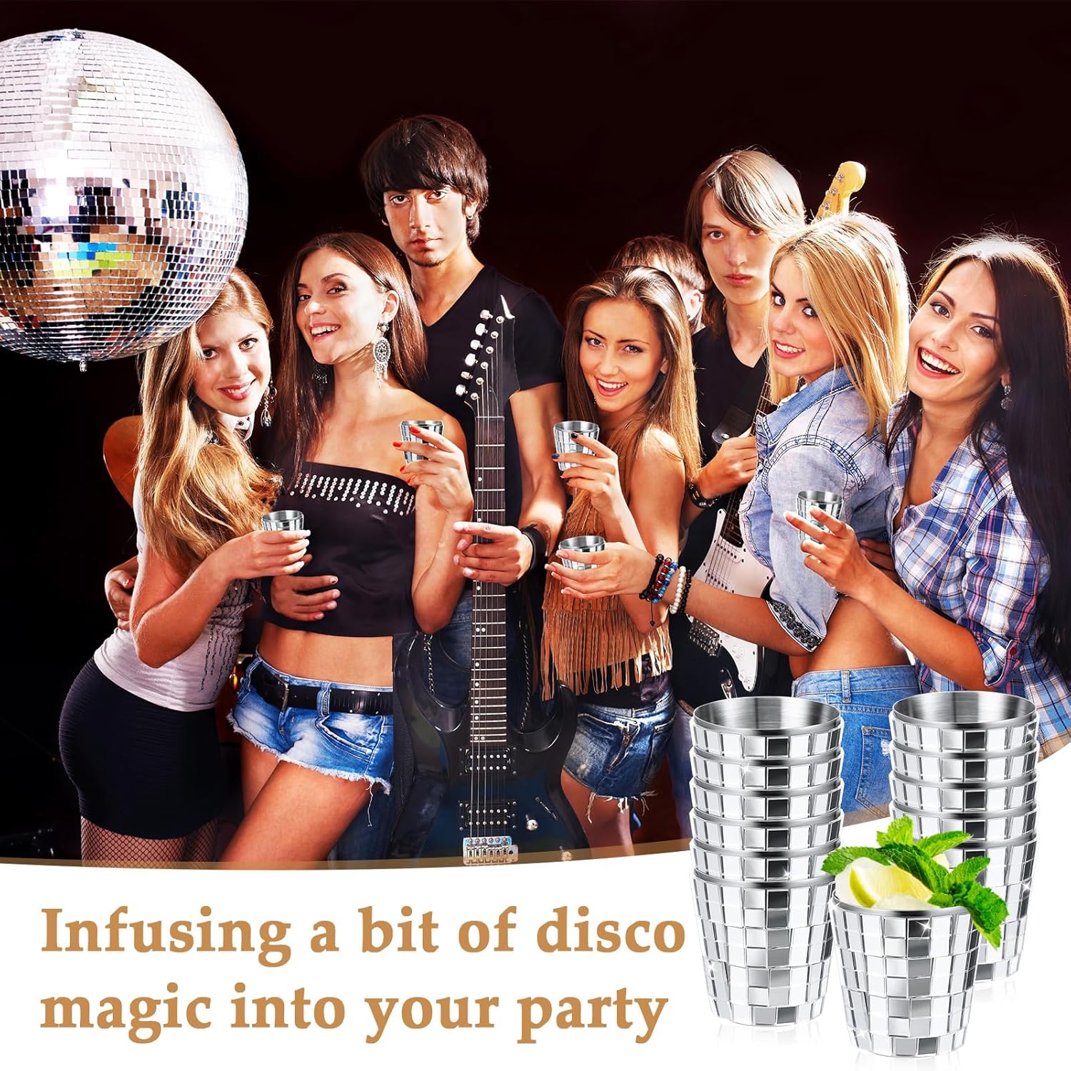 Features: Our disco ball glasses don't just hold your beverages. They create memories. Crafted delicately for your enjoyment and your guests' awe, they are an appealing choice bound to leave lasting impressions, inspiring anecdotes of unforgettable parties. Swing back to the 70s and 80s with our disco bachelorette party decorations. Covered with a glass design, they're reminiscent of a disco ball while providing a sturdy and reliable drinking way for your events. Their innovative design will surely thicken the retro atmosphere. Specifications: Material: stainless steel and glass Color: silver Size: about 1.6 x 1.4 inches/ 4 x 3.6 cm Capacity: 1 oz/ 30 ml Package includes: 24 x Disco ball stainless steel shot glasses Notes: Manual measurement, please allow slight errors on size. The color may exist a slight difference due to different screen displays.