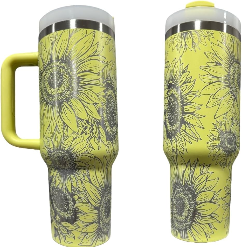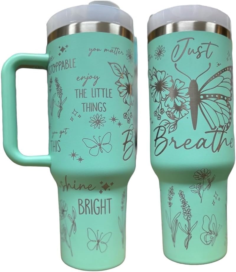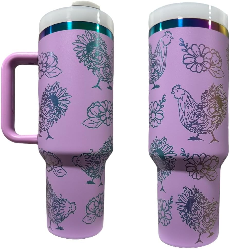 Do you hate refilling your water or coffee constantly? We have the perfect solution for you! These engraved 40 ounce tumblers are a hot item. They keep your drink cold or hot for long periods of time and are convenient to use due to the handle and the straw. We have many different engraving options available as well as different tumbler colors.