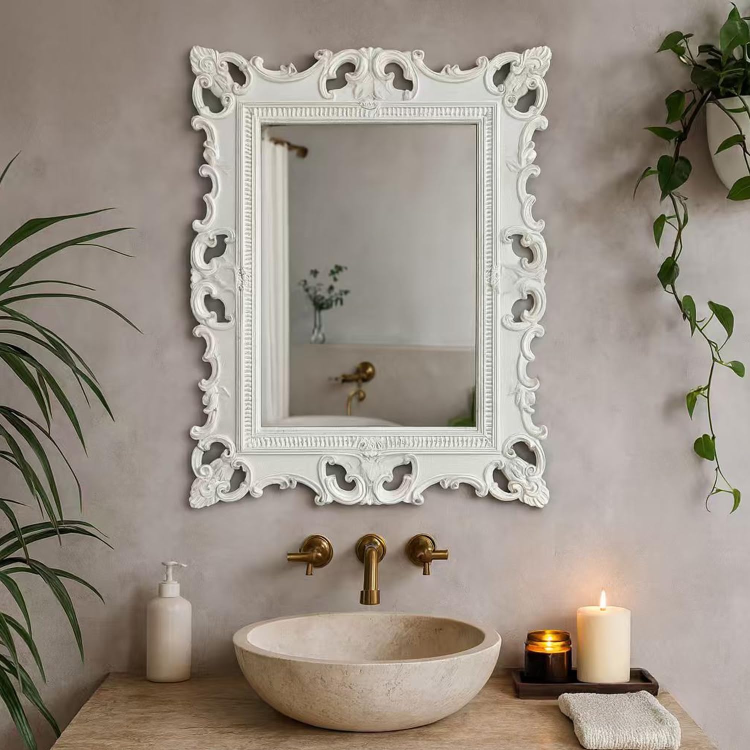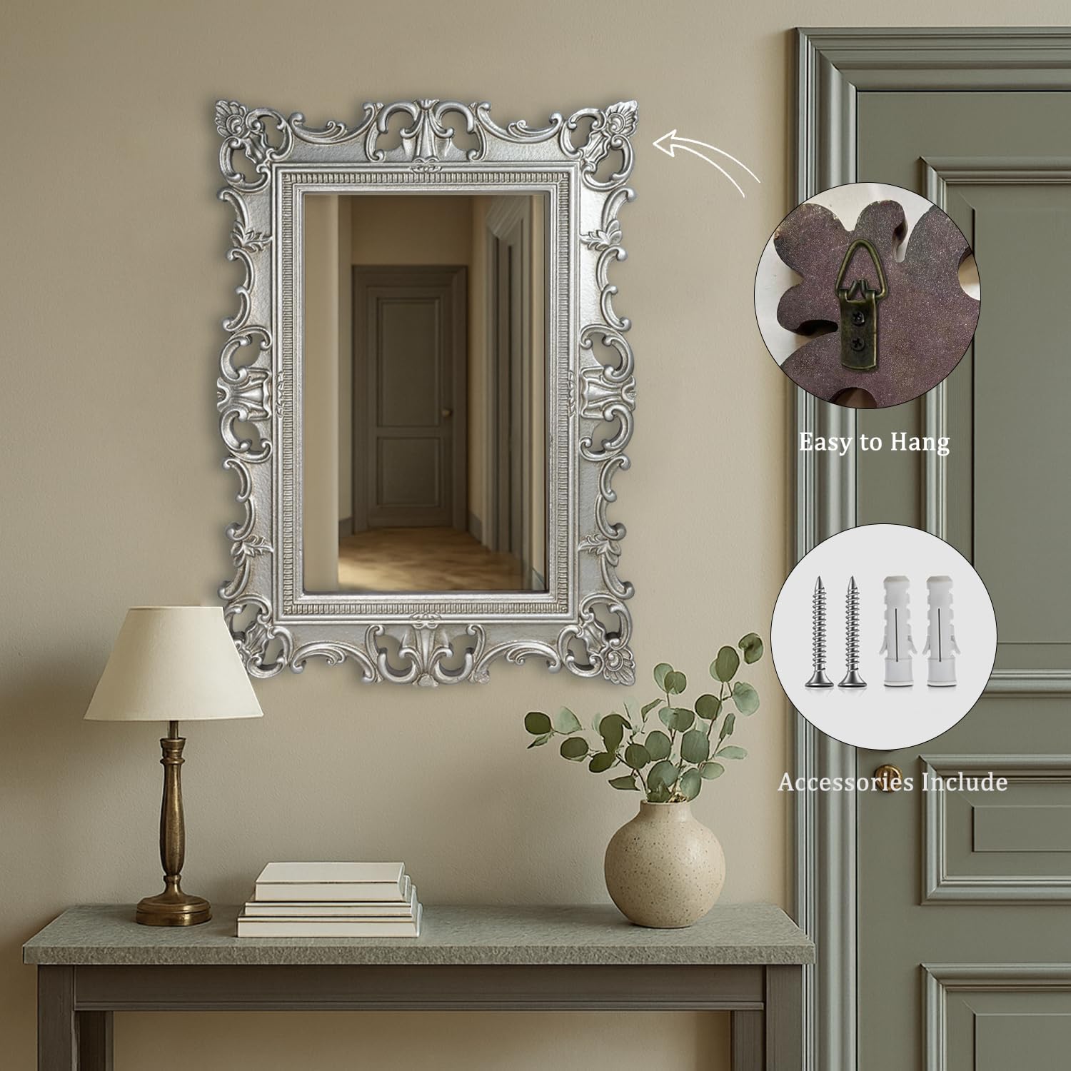 Bring timeless European elegance into your home with this XIAOAIKA Vintage Baroque Silver Wall Mirror. Inspired by classical palace décor, it features an ornate carved frame with graceful scrollwork and floral accents, finished in a distressed antique silver tone for a refined aged look. The result is a piece that feels both luxurious and full of history.The mirror uses premium HD float glass, ensuring a crystal-clear, distortion-free reflection that brightens your space and enhances depth. Its sturdy backing provides long-lasting stability, while the overall construction maintains a lightweight profile for easy hanging.Whether displayed above a vanity, in a hallway, or as a statement piece in your bedroom, this mirror instantly elevates your interior style. It pairs beautifully with vintage, French country, or farmhouse décor themes, making it a versatile accent that complements both traditional and modern homes.Elegantly packaged and ready to hang, it also makes a thoughtful and stylish gift for weddings, housewarmings, or anniversaries—bringing a touch of European artistry and warmth to any home.