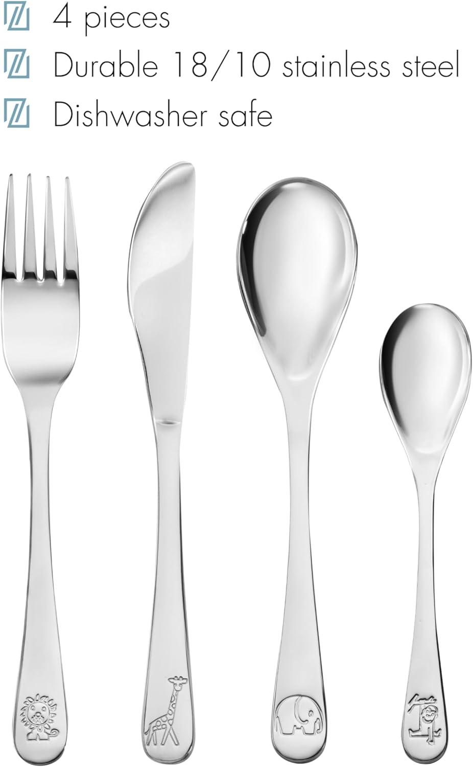 Product Description This 4-piece cutlery set was especially designed for the Miffy film, which takes place in the zoo. The cutlery pieces contain images of an elephant, a monkey, a giraffe and a lion. The set is made of 18/10 stainless steel and is dishwasher safe. All pieces can be engraved. Set Contains: Children's cutlery 4-pcs Miffy Zoo