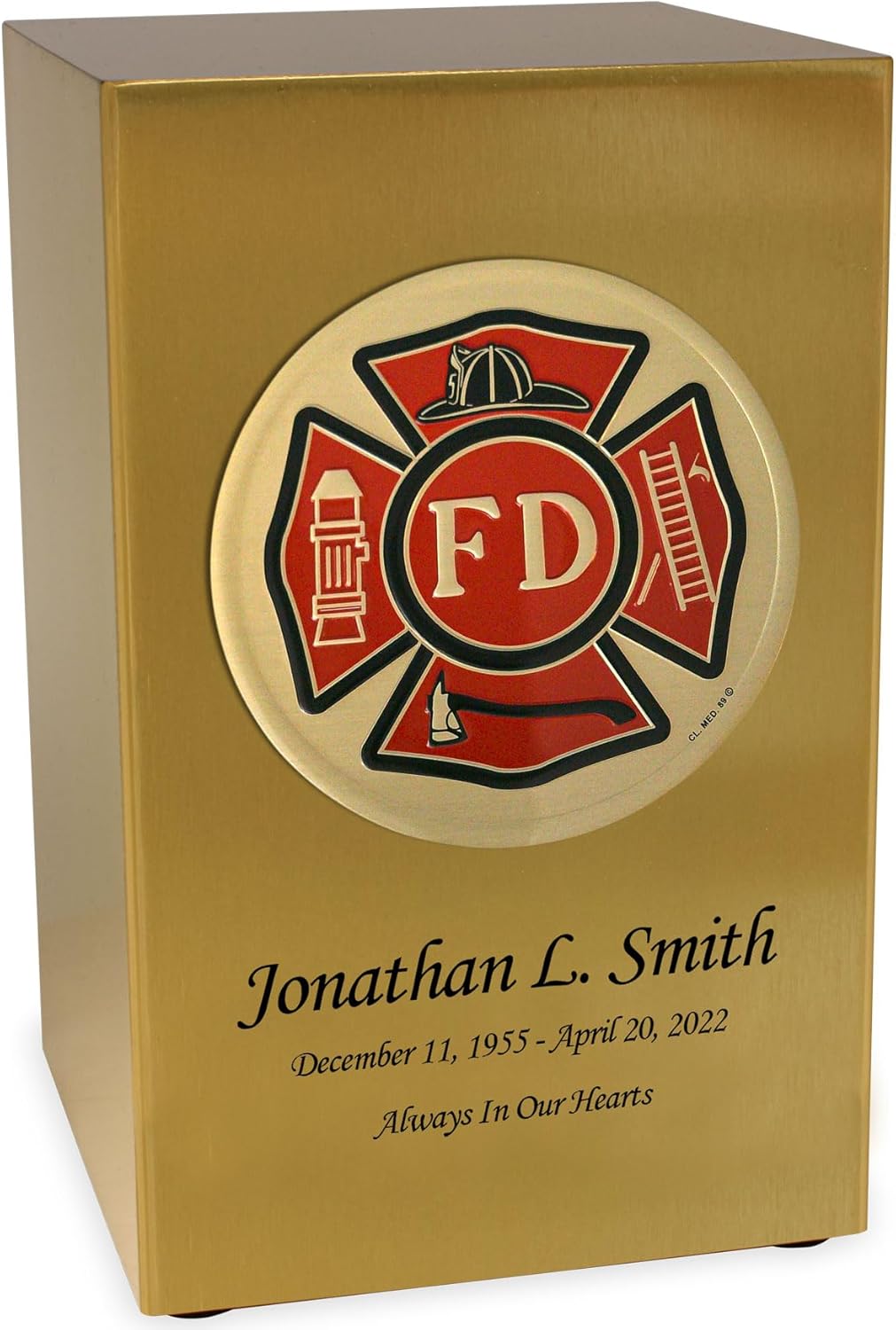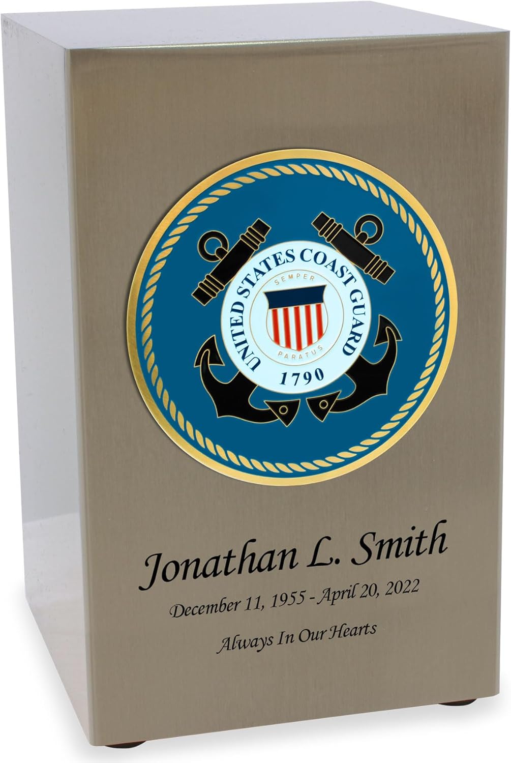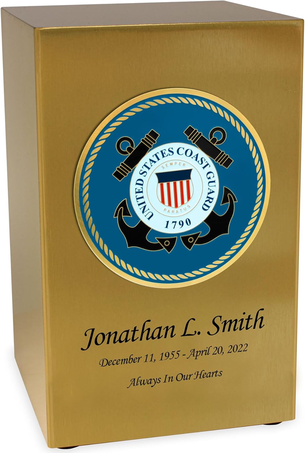 This metal Cremation Urn has a beautiful antique bronze finish and features a four inch, full-color United States Army insignia offering a truly patriotic tribute for your loved one. It measures 5.2" wide x 5.2" deep x 8.3" tall with a capacity of 200 cubic inches which can hold the cremains for someone with a healthy living body weight up to 200 pounds. This rectangular shaped cremation urn is coated in an antique bronze finish. It features four rubber feet to prevent marking and scratching of surfaces. The easy access bottom closure seals via four screws, providing a safe and secure final resting place for your beloved Army members cremains. This urn can be beautifully displayed on a shelf and is ideal to place beside other military honors and medals to complete the story of a life of service. The urn is also ideally sized for placement inside a cemetery niche. This antique bronze urn can be personalized with up to 40 characters per line for name, date, and sentiment.