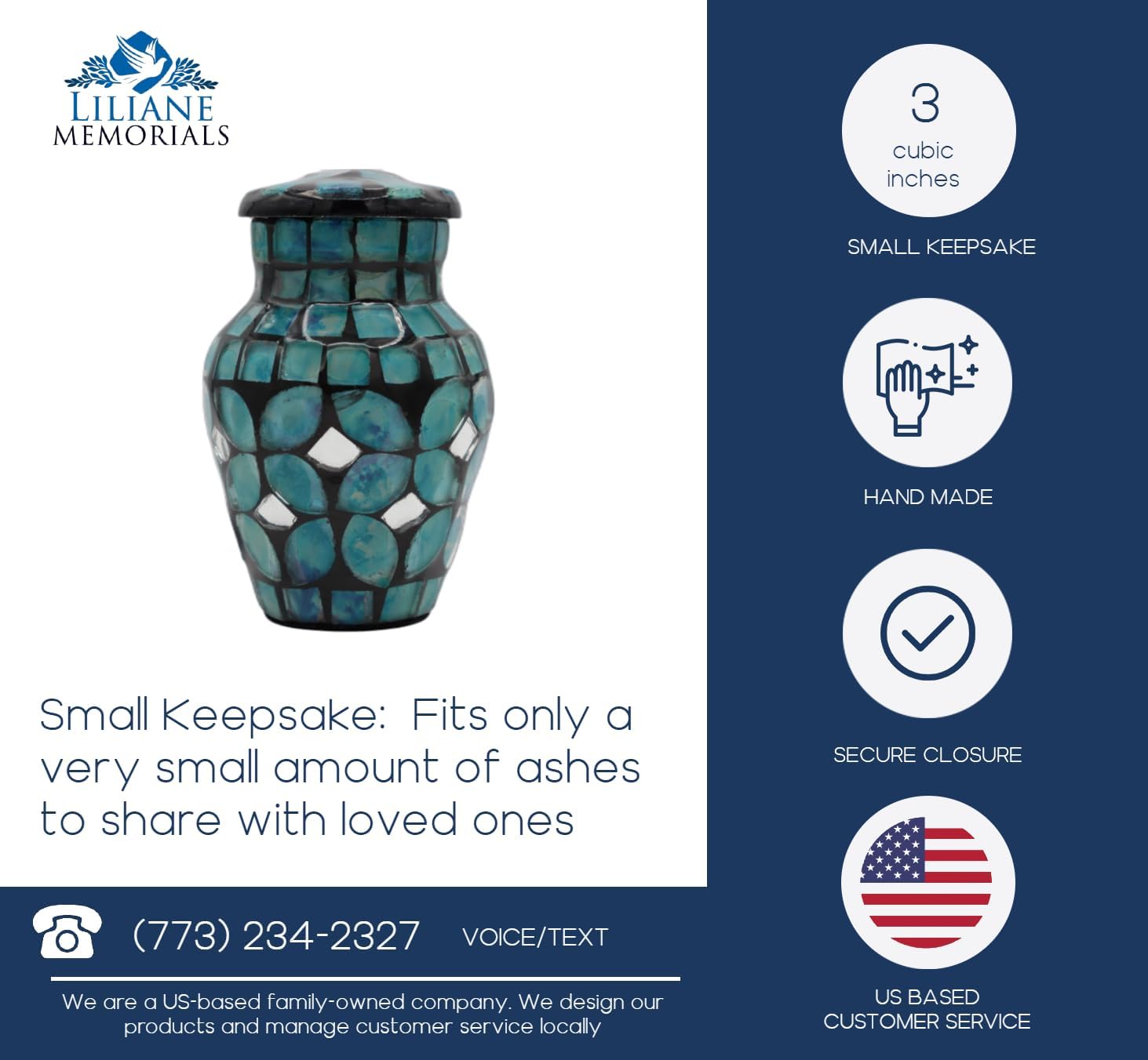 HANDCRAFTED miniature keepsake cremation urn. Each individual urn is a unique work of art to commemorate a beautiful soul. Hand applied and glued blue glass tiles form a brilliant pattern that is as unique as your loved one. Includes a black velvet storage or gift bag. KEEPSAKE SIZE is designed for sharing a small portion (3 cubic inches / 3 tablespoons) of cremated remains ashes among family members. Can hold human cremains or ash of a pet, a flower petal, earth from a gravesite or a lock of hair.SCATTERING CEREMONY: Perfect for keeping a small memento after a scattering ceremony. Keep a small amount of remains, sand from a beach, soil from urn burial location, or water from the ocean or river where scattering ceremony took place.Quality you can feelEach urn is handcrafted by an experienced artisan in India. Made in metal for indoor use, the urn is made with hand-applied glass pieces and finished in a beautiful shiny lacquer that will not tarnish or fade. SAFE STORAGEMade with a secure metal screw lid to ensure safe keepsake.IMPORTANT This is a keepsake or token urn that measures just under 3" in height and fits approximately 3 cubic inches. Liliane Collection carries a full line of full size urns on Amazon (including matching mosaic urns)THIS IS A SMALL MINIATURE URN THAT FITS A VERY SMALL AMOUNT OF CREMAINS