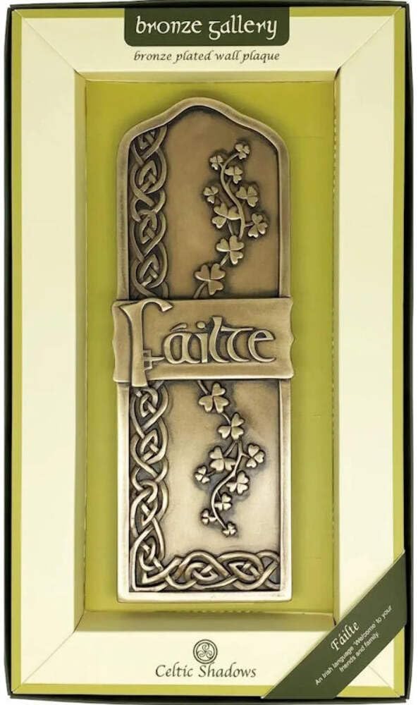 Let your loved ones know how welcome they are in your life. Our Failte plaque features the “Failte” inscription with scattered shamrocks and Celtic Knotwork on the margins, alluding to the welcoming nature of the Irish people and symbolizing their beliefs. The item is bronze plated, being durable, rust- and corrosion-resistant, and having a timeless appearance of warm golden color. Measuring 10” in height and 3.5” in width, our Failte plaque becomes the perfect gift to give to your family and friends. Authentically produced in Ireland by Royal Tara, it is a Celtic-inspired souvenir. To clean the surface, dip a clean soft cloth in a solution of two cups of distilled water and one tablespoon of mild dish soap.