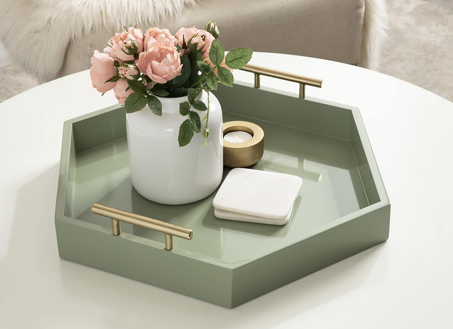 Bring modern glam style into your home with this hexagon shaped decorative accent tray. The Lipton tray is perfect for showcasing mid-century modern style with its calming evergreen fog green finish and unique shape. Place this charming tray on your entrance console table as a trinket tray to hold your keys and mail, as a serving tray for your next fancy get-together, or a makeup tray next to your vanity. This tray can also be used as a decorative accent on an ottoman to hold your media remotes or on a console as a decorative surface for plants, photos, and other family keepsakes. Constructed of lightweight material with a glossy finish and polished metal handles, this tray is sturdy yet refined, giving your home a beautiful mid-century theme with a practical design. The tray measures 18 inches wide, 18 inches deep, and stands 3.25 inches high, giving you plenty of room for various purposes. The Lipton allows you to bring a chic and glamorous decorative accent into your home that helps you layer your decor and provides you with another functional space to play with.