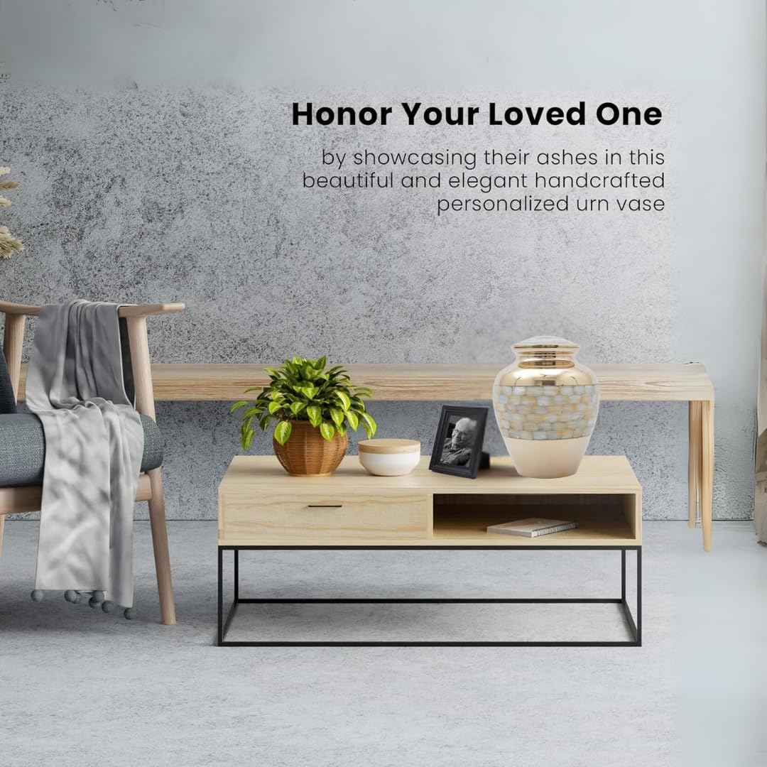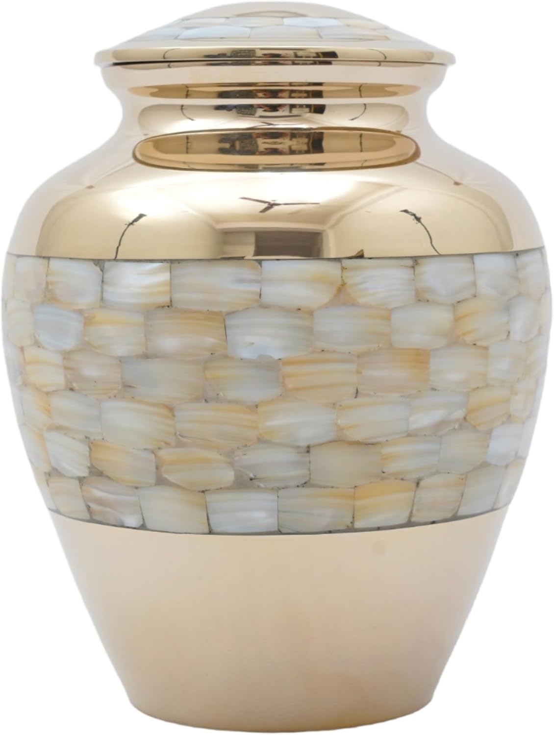 Honor your loved one's memory with this exquisite cremation urn, featuring a stunning blend of elegance and craftsmanship. The urn showcases a beautiful mother-of-pearl mosaic pattern in soft cream and ivory tones, meticulously arranged in a checkerboard design that wraps around its classical vase silhouette. The gleaming golden brass top and base perfectly complement the pearlescent center, creating a harmonious balance of warmth and sophistication. With a generous capacity of up to 200 cubic inches, this full-sized urn provides a dignified resting place. Its timeless design makes it suitable for display in any setting, from home to columbarium. The urn's sturdy construction ensures lasting durability, while its refined appearance serves as a beautiful tribute to cherished memories. Each detail has been carefully considered to create a memorial piece that combines grace with enduring quality.