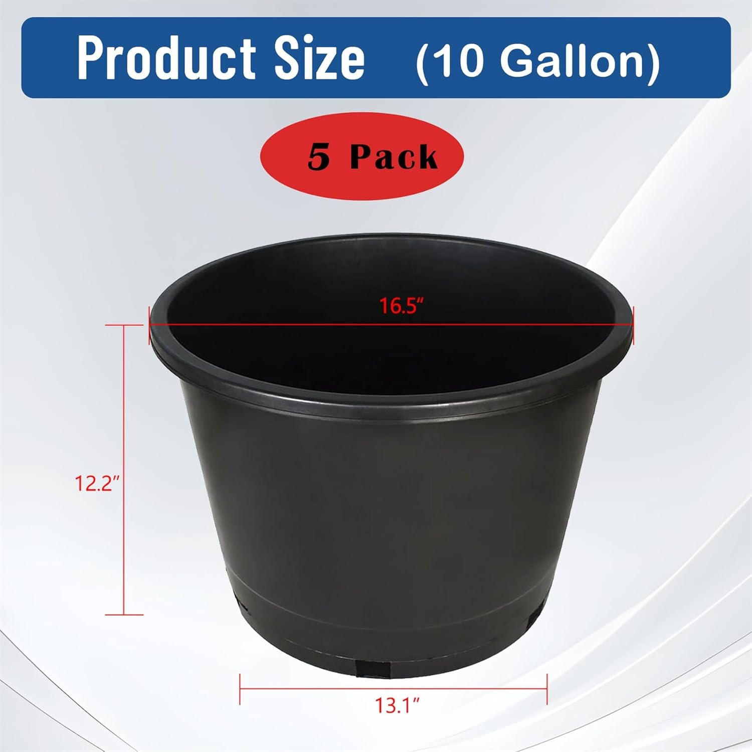 SpecificationsUp Diameter: 16.5 InBottom Diameter: 13.1 InHeight: 12.2 InPackage Includes: 5 Packs 10 GallonColor: BlackMaterial: Polypropylene Features:ReusableThis nursery pot material is made of superior polypropylene, which is can be used for a long time. It is not easy to crack after long-term use, can be reused, and does not fade easily. It is a great choice for both indoor and outdoor use.Drainage holesThere are drainage holes at the bottom of the gallon nursery pot, which can be properly drained and can avoid plant waterlogging affecting plant growth or death as far as possible. Contributes to the air circulation of the soil and the growth of plants.SturdyThe gallon pot for plants has strong flexibility and is not easy to be damaged. It is flexible and has good load-bearing capacity. Gallon pots for plants is squeezed or slightly bumped, it is not easy to break.Convenient designThe raised edge design allows you to better handle and move the planter nursery pot. In addition, the appearance of the planter nursery pot adopts the simple design of pure black without doping other colors. Easy to use, but also simple and generous appearance.Widely usedThe gallon pot for plants with drainage can be used indoors, outdoors or in nursery. You can use it to grow your favorite plants, flowers, vegetables. Or you can use it with professional nursery cultivation, gardening, etc.Note:Due to manual measurement, the size may be slightly different.