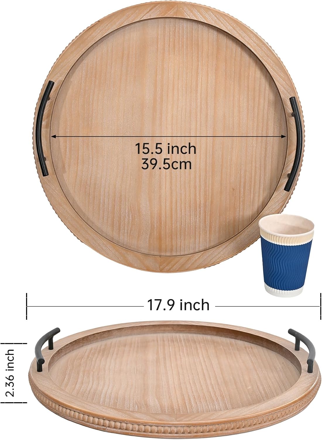 SwallowLiving 18Inch Brown Wooden Beaded Serving Tray with Handle Decorative Rustic Tray for Coffee Table Farmhouse Round Tray for Kitchen, Living Room and Bedroom