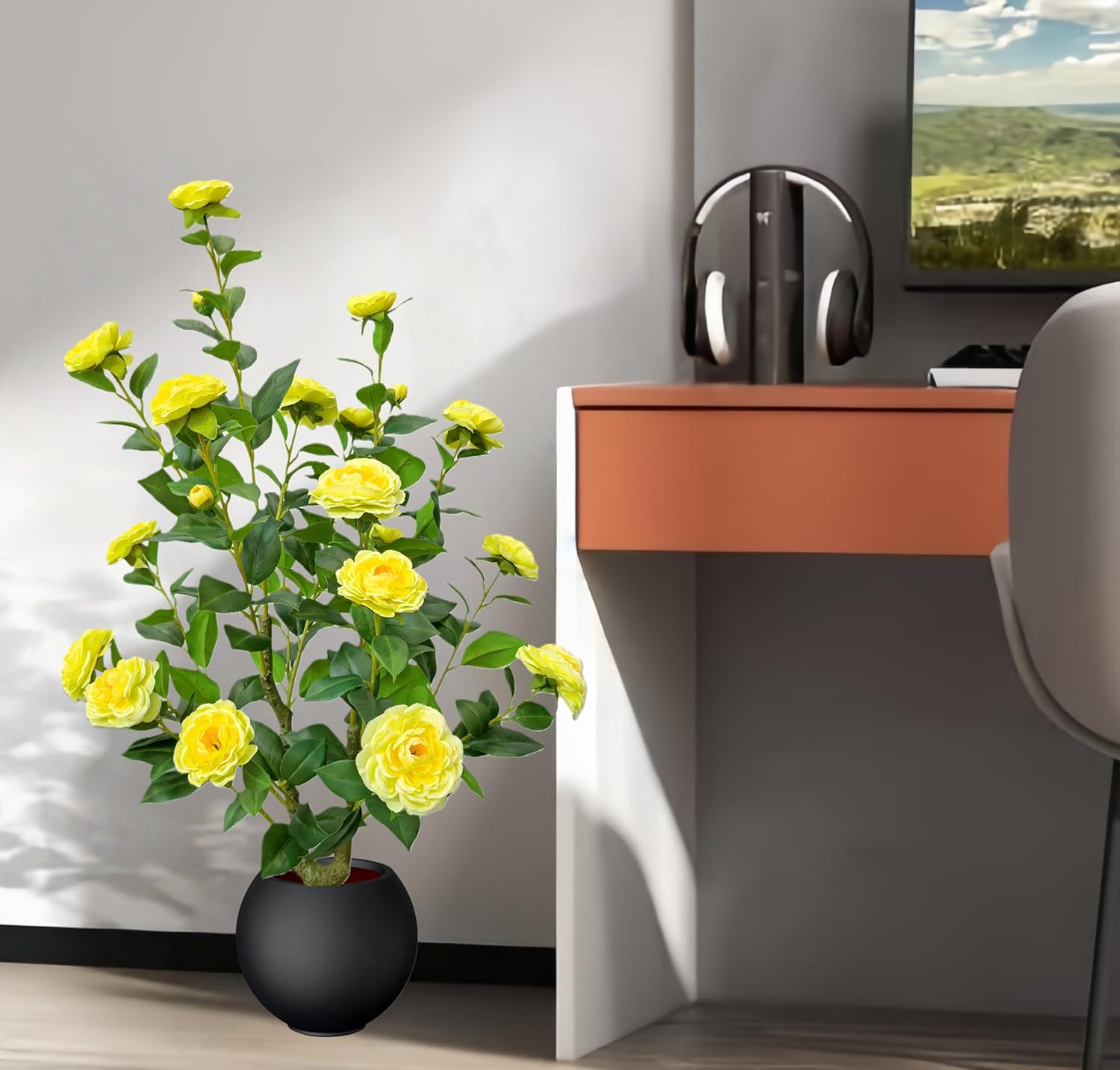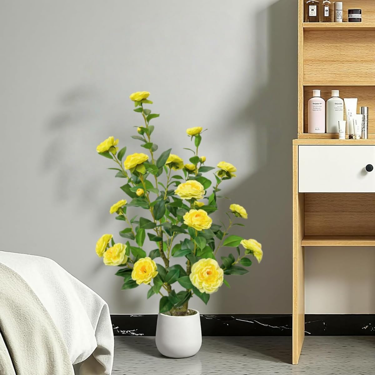 The Outdoor faux plant indoor or outdoor is meticulously crafted with vivid leaves, bright flowers, and simulation tree trunk. And featured with a stable planter pot, the yellow tree set ensures high safety. Ideal for both indoor and outdoor settings like patios, porches, gardens, and offices, this artificial outdoor plants with well-crafted details is a versatile addition to any space. Features: Bring elegance with vivid fronds Simulation tree trunk makes the tree more appealing realistic and lifelike leaves and flowers Made of all-weather material, not affected by weather and environment that cause wilting Keeping bright colors in all seasons, creating a natural and fresh atmosphere Ideal for both indoor and outdoor settings like patios, porches, gardens, and offices. Specifications: Color: Green + Yellow +Black Material: PVC, Metal Height: 38” Dimension of Planter Pot: 5” x 4.4” x 4.5”H Net Weight: 11lbs Package Includes: 2 x Artificial Camellia Tree
