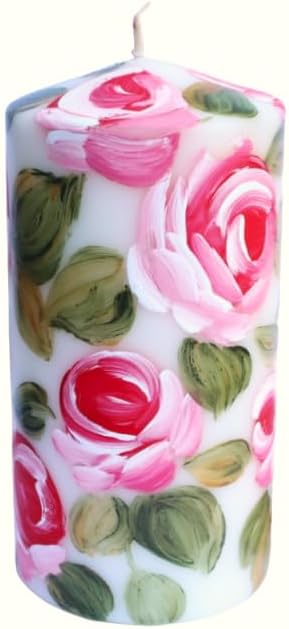 A romantic addition to any decor, this large creamy white candle is covered with large hand-painted pink rose blooms, with golden-green leaf accents! It's a beauty, with its artful, feminine style...just place it on a decorative plate or pillar candle holder as a part of a centerpiece or on its own! Painted using quality paints, your candle will burn cleanly as it adds its soft light to your room! Pillar Candle 6" tall, 2 3/4" wide
