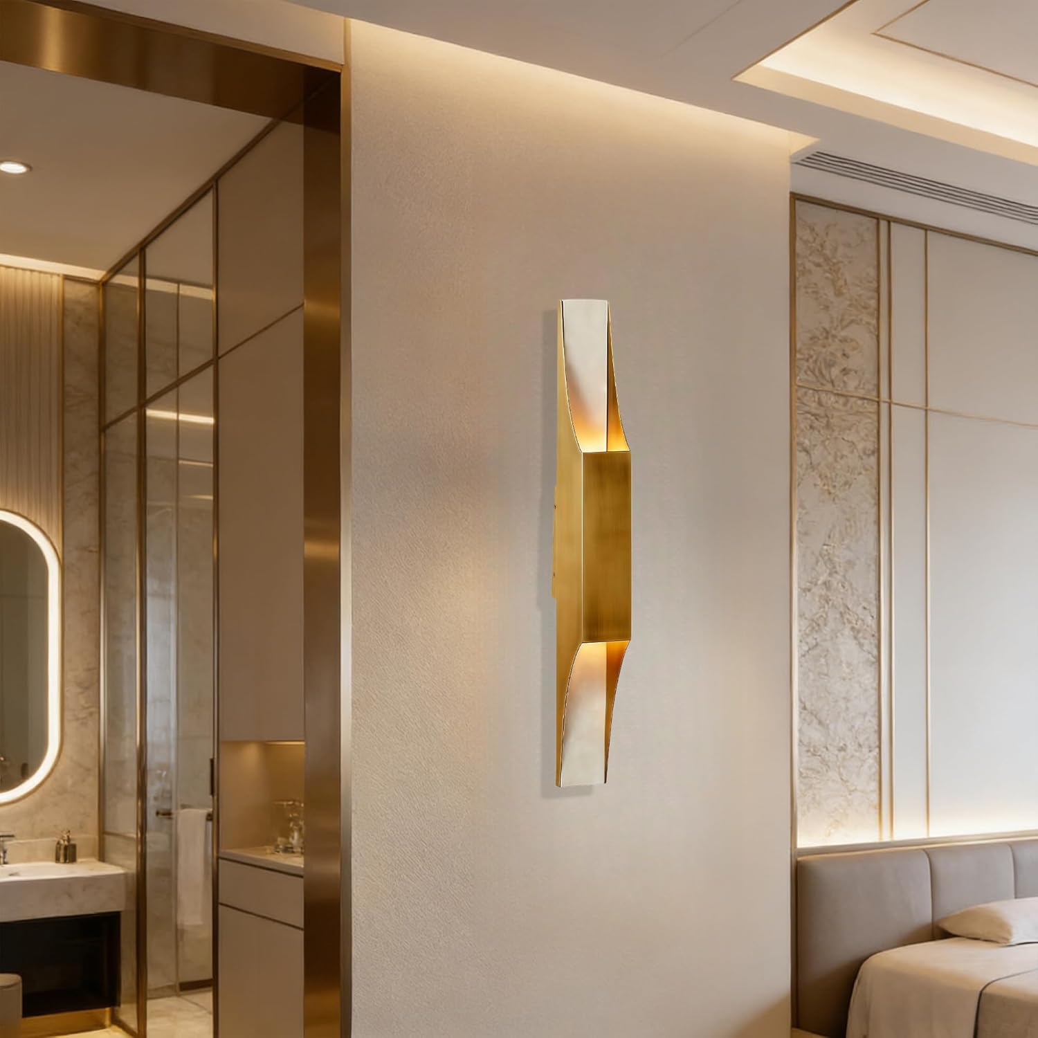 🌷Introducing our stunning sconce, the perfect addition to your home decor! This elegant wall sconce combines the beauty of natural travertine stone with a sleek brushed brass finish, creating a sophisticated and modern look.Ideal for bedrooms, living rooms, or kitchens, this wall sconce will illuminate your space with a warm and inviting glow. The metal plate in brushed brass reflects light onto the textured white travertine, adding a touch of elegance to any room.