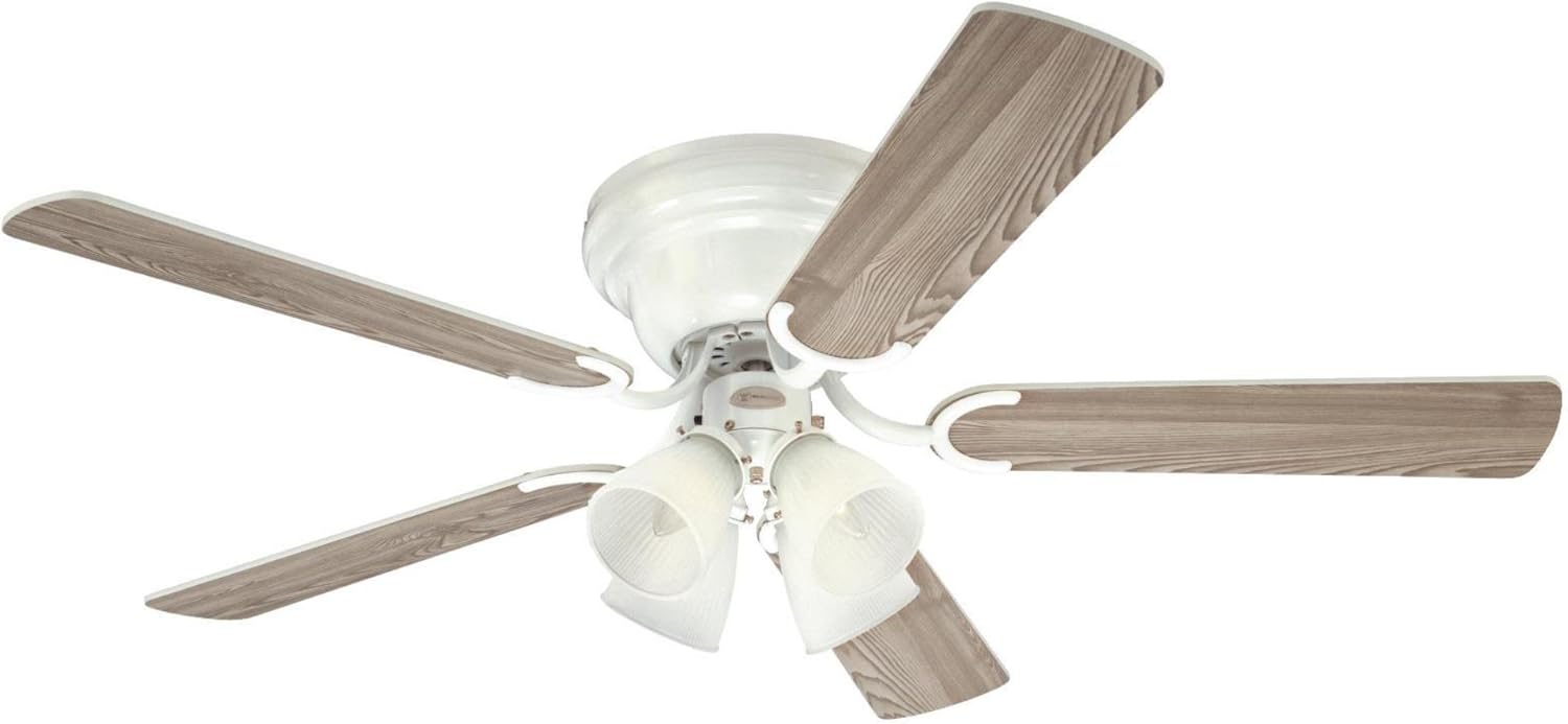 Enjoy distinguished style and year-round comfort with the Contempra IV indoor fan. The white finish provides a clean look. Reversible blades in complementary finishes give you options for matching your room's decor. Choose from white or white washed pine finish blades. The light kit features four frosted glass shades that provide generous lighting. The fan's hugger mount style is perfect for large rooms with low ceilings. This fan includes four candelabra base, 40-watt torpedo light bulbs. This Westinghouse ceiling fan is backed by a lifetime motor warranty and a two-year warranty on all other parts. Westinghouse is a trusted, global brand. Westinghouse knows lighting and offers products with exceptional quality, reliability and functionality. Product reference number 72164.