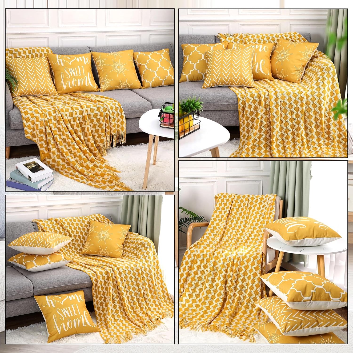Features: With our standard decorative throw pillow covers size, you can effortlessly update your home interior. These pieces are designed to suit a wide range of home decoration styles, proving that they are not just about looks but functionality too. Our pillow covers and cotton muslin throw blanket are suitable for various spaces, including the home, bedroom, living room, guest room, dorm room, and even outdoor spaces like patio porch. They also go well with a car, chair, sofa, and bed. Elevate your spaces with our highly versatile products for an elegant, harmonious look. Specifications: Material: knitted and linen material Color: yellow Size: Pillow covers: about 18 x 18 inches/ 45 x 45 cm Muslin throw blanket: cotton muslin throw blanket is about 51 x 71 inches/ 130 x 180 cm (W x L) Package includes: 8 x Pillow covers 1 x Muslin throw blanket Notes: Manual measurement, please allow slight errors on size. The color may exist a slight difference due to different screen displays.