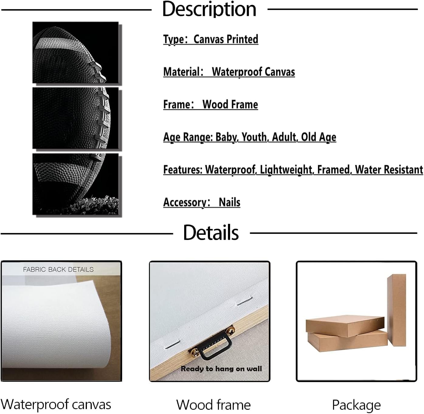Black And White Poster Football Sport for Boy's Room Wall Decor Canvas Painting Rugby Home Decorations Frame CanvasPainting Feature:We use great canvases which are designed specifically for canvas printing.HD picture prints on canvas with vivid color,waterproof,non-fading features.Stretched and framed on back of canvas,ready and easy to hang,all frames are made of wood.Wall Painting Decoration Guide:Good choice for bedroom,dressing room,living room,guest room,meeting room,bathroom, dinning room,coffee bar,nurseries house,hallway,corridor,college dormitory,hotel,inn,spa,lounge,salon,dressing room,meeting room,home,office decor or waiting area,etcPerfect Goods Idea:Good choice idea for holiday,wedding,Valentine's Day,Anniversary,Father's Day,Mother's Day,Birthday...Note 1:All of the paintings sizes switched:1inch=2.5cm,Thickness:2-3cm.Note 2:There might be slightly difference in color,because of the computer monitor settings.Note 3:Get satisfaction guarantee.If any questions, please email us first time,believe that we can make you satisfied through our efforts.About Us:We are a professional canvas prints manufacturer and online supplier for modern canvas wall art,include canvas printings,handmade oil paintings, watercolor paintings,abstract art paintings ect...have been engaging in canvas artwork for more than 20 years.Our objective is to provide customers the new canvas prints at the most attractive price.We hope it is not only transaction,but also make your life better.Thanks!football wall decor football room decor football sports canvas football graffiti wall art bathroom fashion art canvas painting football decor for boys room