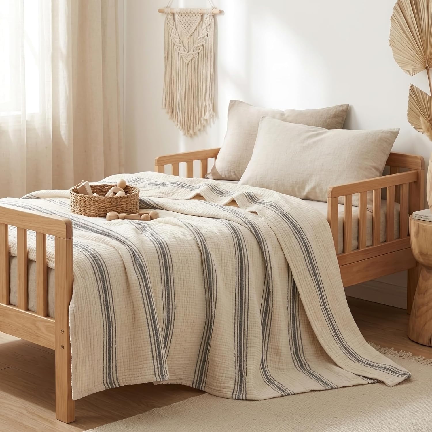 Handmade 4-layer muslin throw (50 × 70 inches) in natural undyed ivory with 5 black stripes, crafted from 100% cotton muslin. Lightweight yet substantial gauze construction offers breathable, year-round comfort with a naturally crinkled texture that requires no ironing. Designed as a multipurpose throw for sofa, couch, bed layering, or travel use. This listing includes one throw only. Handmade in Turkey.
