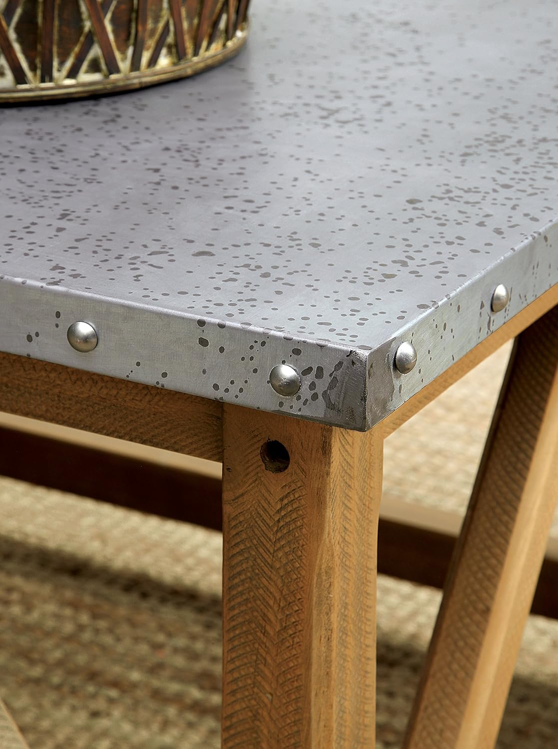 Create an open and utilitarian appearance with this industrial style coffee table. The galvanized iron top offers a beautiful complement to any modern living space, and comes supported upon natural toned wood legs. Reinforced beams provide a durable framework for the wide tabletop, which takes center stage with its nail head trim and corner welting marks.