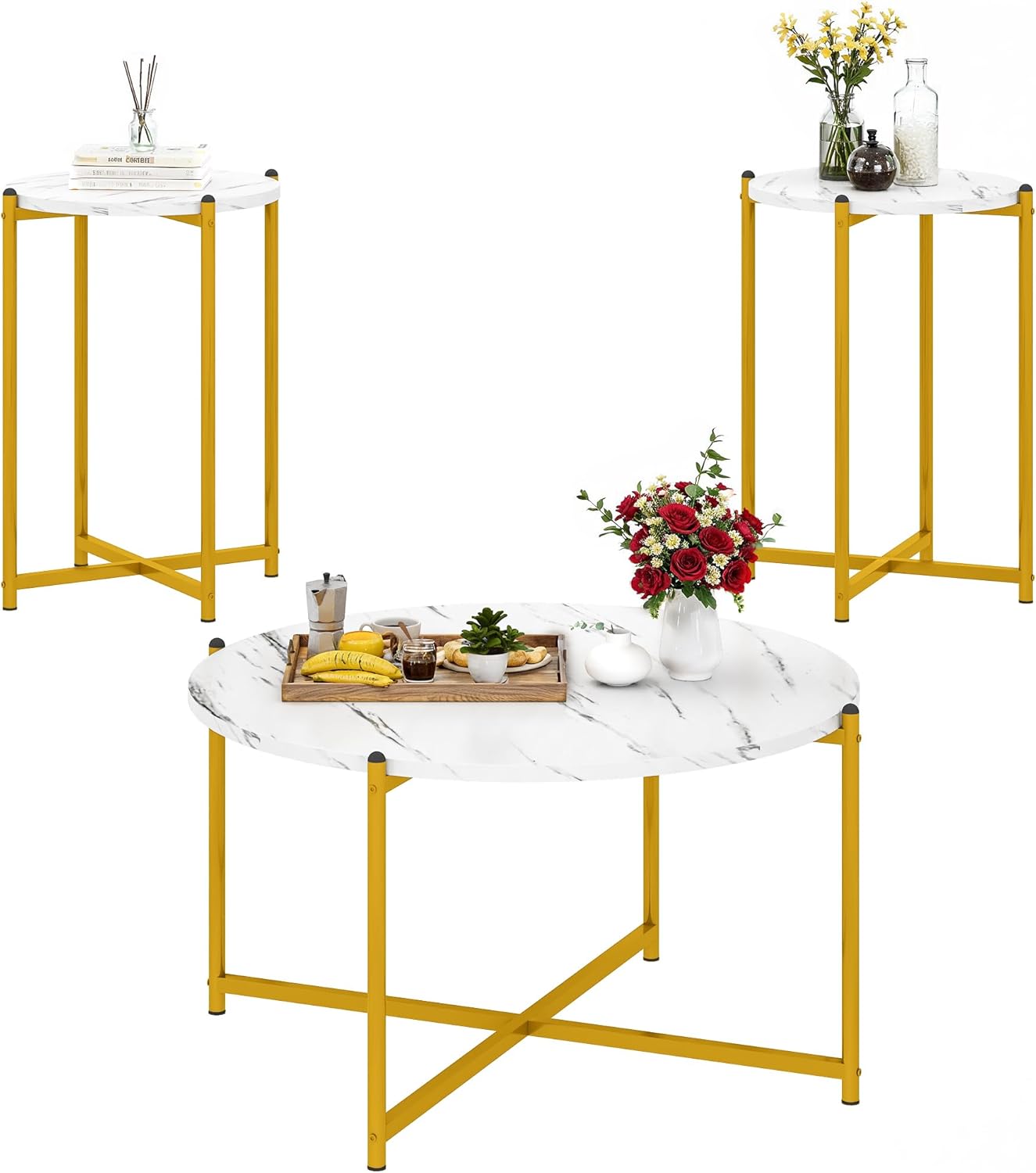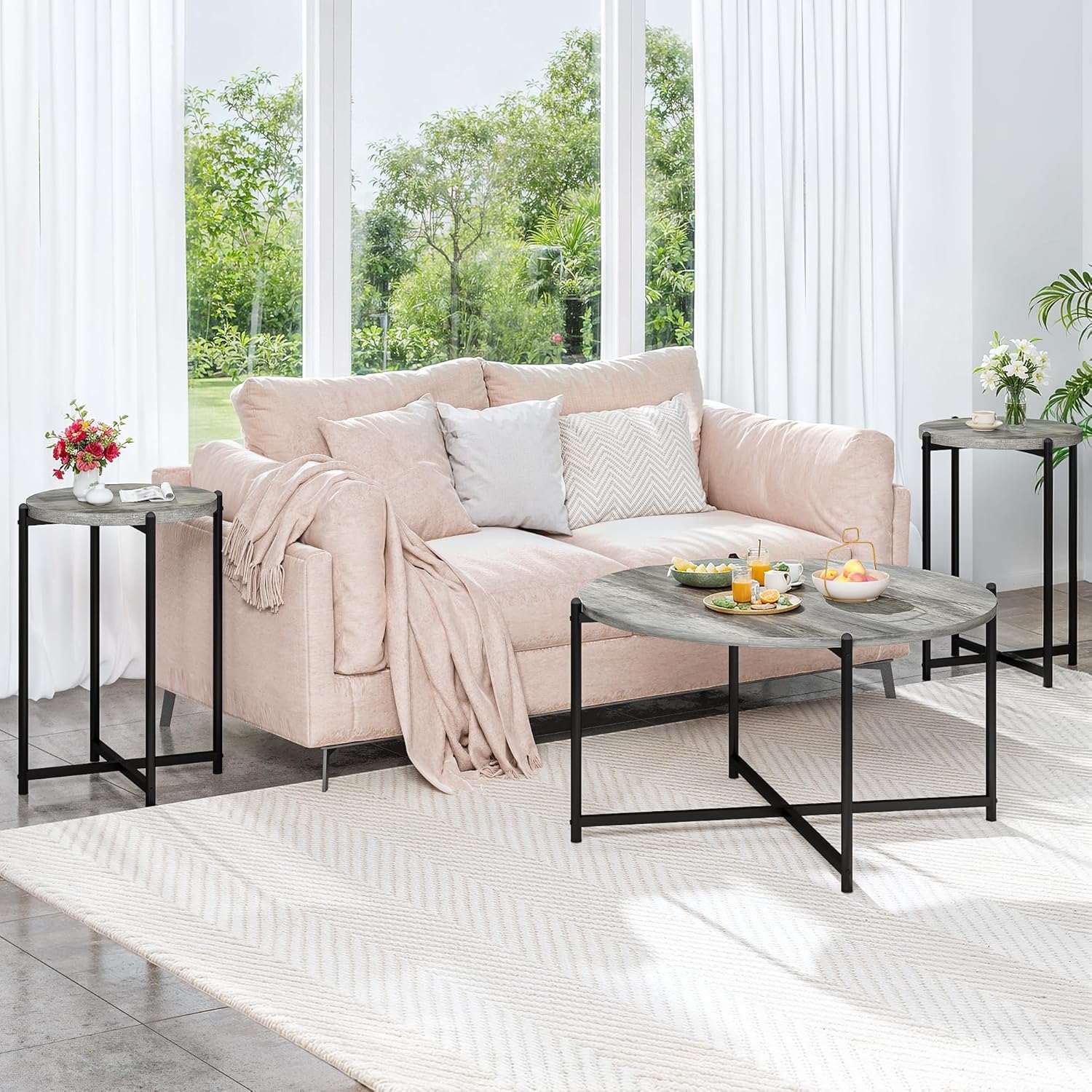 3 Piece Coffee Table & Side Table Set Elevate your living room with this chic coffee table set! This coffee table and 2 end table set can effortlessly blend in with different decor styles, elevating the overall aesthetics.Key Features Sturdy Build: High-quality tabletops + metal frames for lasting use.The coffee table set features a X-shaped reinforced structure for added durability and sturdiness. Smart Storage: Coffee table and side tables have open lower shelves—ideal for books, decor, or daily essentials. The living room table set with spacious tabletop provides ample surface space for you to place drinks, snacks, remote controls, and decorative items. Versatile Use: 1 coffee table + 2 side tables. Use side tables as sofa companions or extra serving spots when hosting. Easy Assembly & Maintenance: Setting up this accent table set is a breeze with included instructions and hardware. Assemble in minutes! What You Get: 1 Coffee Table, 2 Side Tables.
