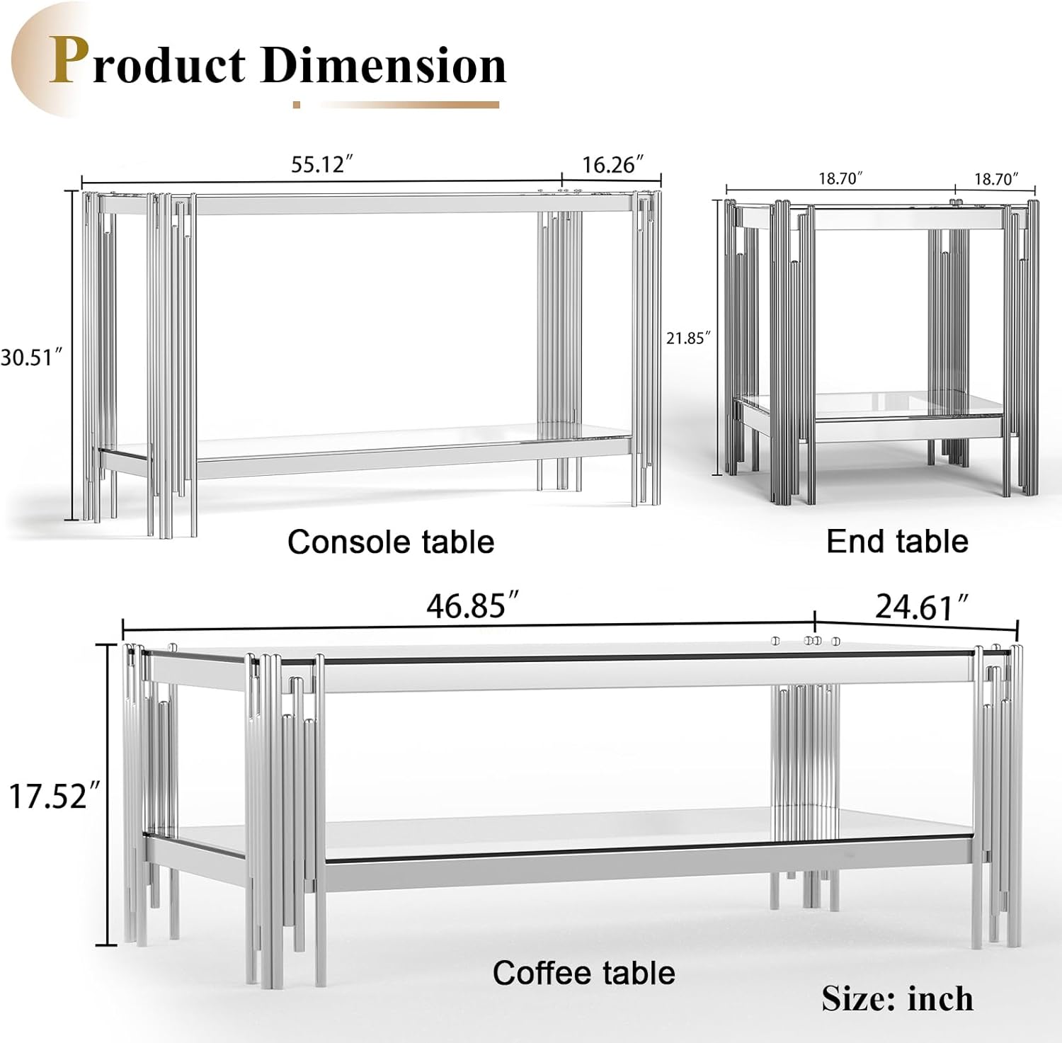 Bring a beautiful touch of modern to your home with the living room table set. With two shiny tempered glass shelves and Irregular cylindrical stainless steel pipe welding, this coffee table is designed to stand out in your home. Add a pop of industrial chic to your home with this striking coffee table/end table/console table. Stainless steel and glass are easy to clean and durable for beauty that will last. The coffee table/end table/console table in the collection with decent size to perfectly fit your home. Key Features: 1. More Storage Space: It comes with two tiers in glass which would maximize your storage demand as well as wouldn't take up too much space. 2. Luxury Design: Gold and silver stainless steel frame structure, suitable for different home occasions 3. Sturdy and Long Lasting: Using stainless steel and mirror finish to ensure the console table always keeps its shine and long using time. 4. Easy to Clean: Glass top is easy to clean when it gets dirty, just wipe it with clean water. 5. Simple Installation: All hardware and assembly instruction are provided, one person can easy to install within a short time. Specification: 1. Coffee Table dimension: 47.2â€L x 25.6â€W x 17.7â€H 2. Console Table dimension: 55.1â€L x 17.7â€W x 30.7â€H 3. End Table dimension: 19.7â€L x 19.7â€W x 21.6â€H 4. Material: Tempered glass+stainless steel frame 5. Color: clear gold/black gold/clear silver/black silver