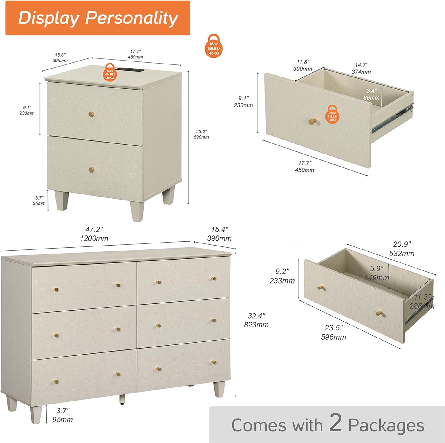 WAMPAT 3 Pieces Living Room Table Sets - Includes 47.2" Dresser TV Stand with 6 Drawers for 55 Inches TVs & Set of 2 End Tables with 2 Drawers and Charging Station for Bedroom, Beige