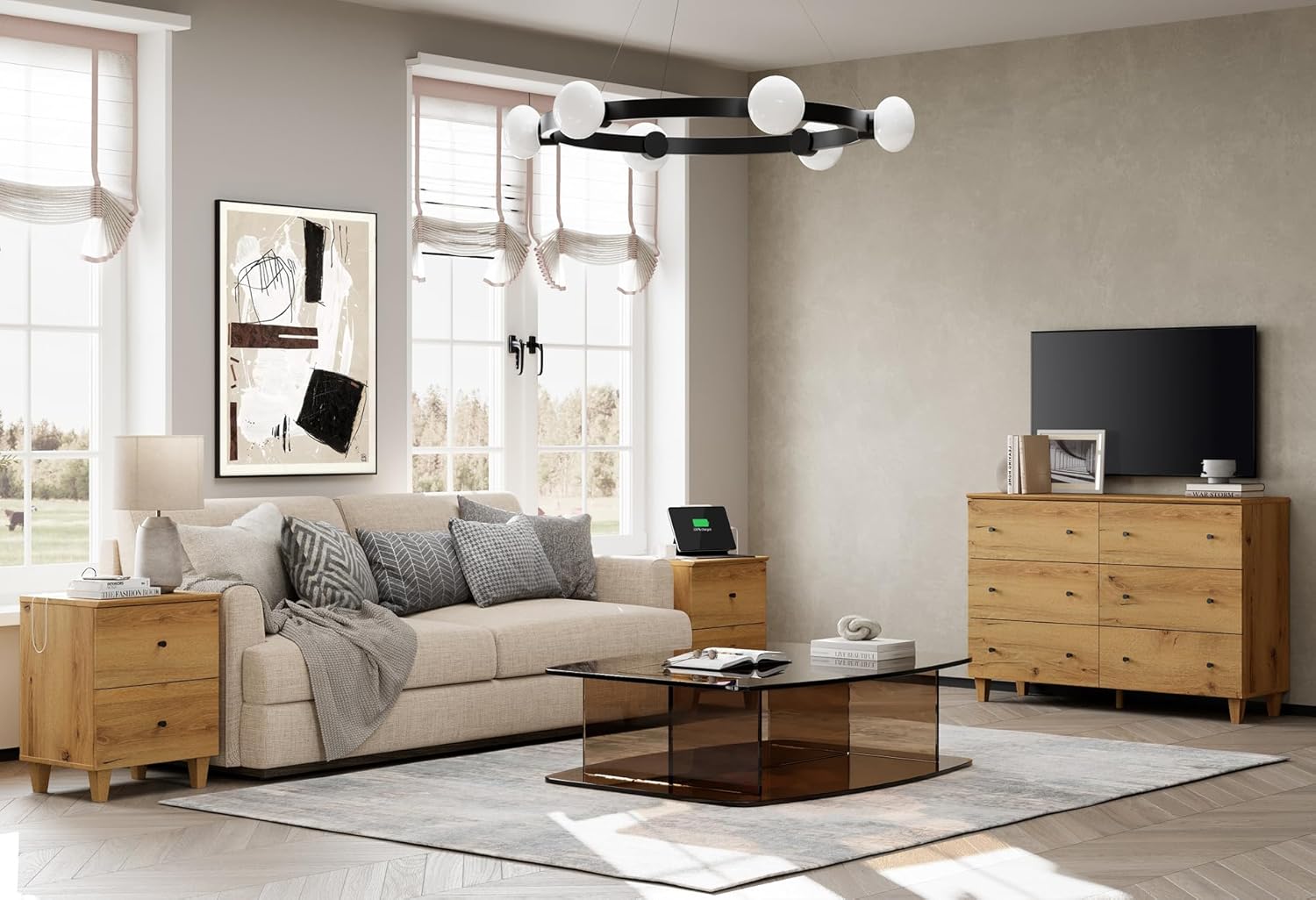 | Included Components | 6 Drawer Dresser TV Stand, Anti-tip Kits, Assembly Manuals, Hardware Packs, Set of 2 End Tables with Charging Station |