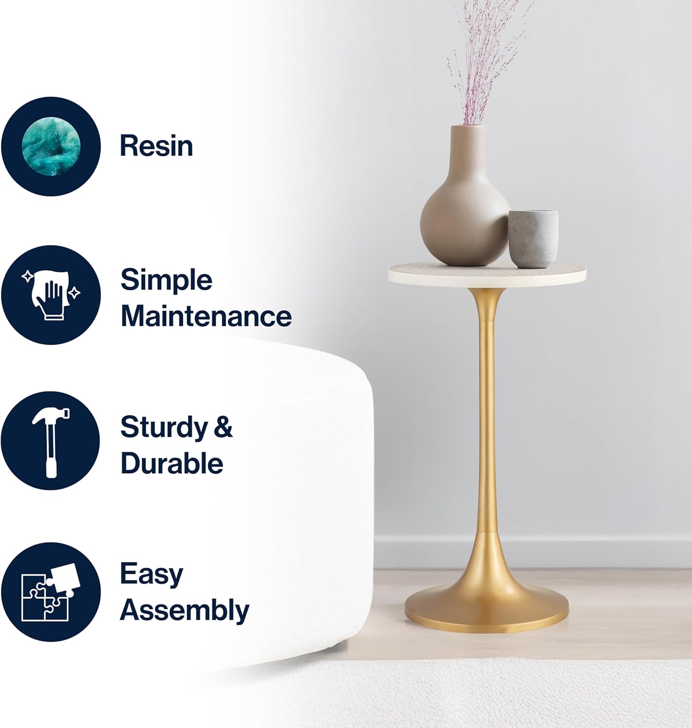Show off your favorite plants or serve cocktails on our global-inspired pedestal stand. The modern design features an inlay resin top with a vine pattern and a sleek, sturdy metal base. This designer accent table is a chic addition to the living room, dining room or bedroom.