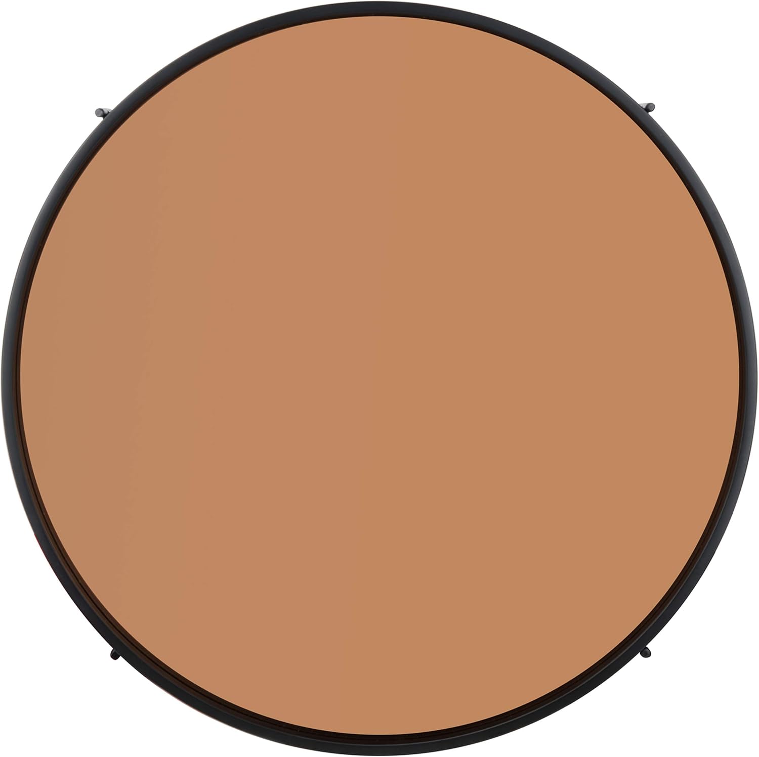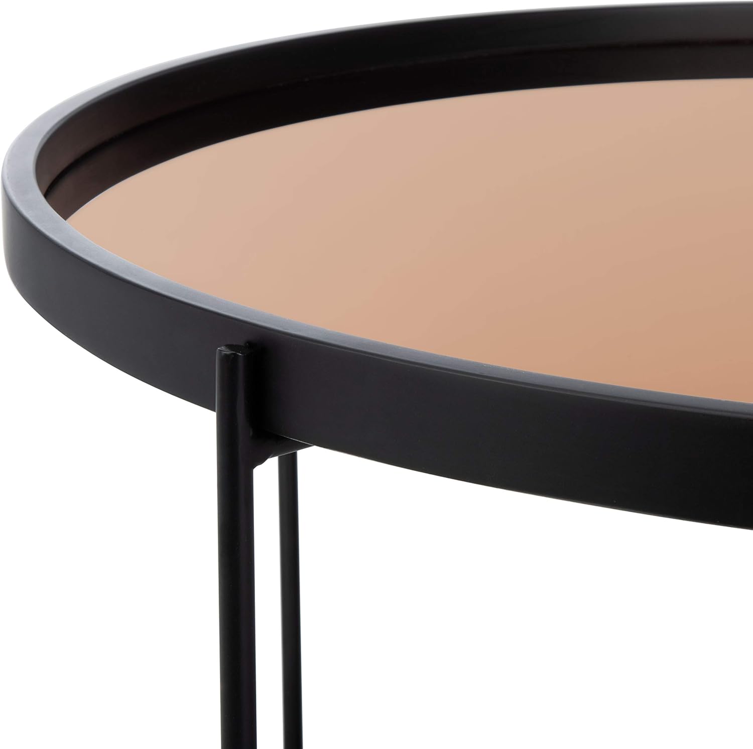 Brilliant color, rich materials, and bold Form define this contemporary round tray top coffee table. Ideal for any living room, slender geometric Black iron legs elevate the minimalist Black wood frame surrounding its versatile rose gold glass tray top.