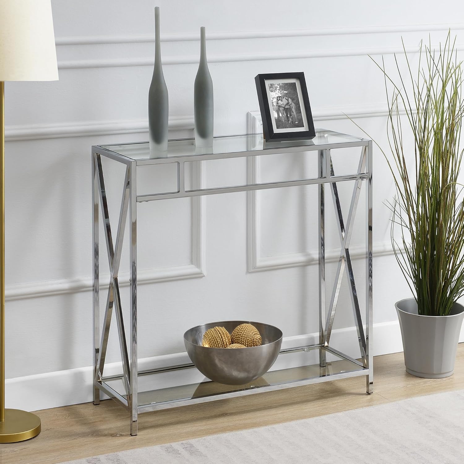 Add glam to your entryway with the Oxford Chrome Glass Hall Table with Shelf by Convenience Concepts. This contemporary table will bring luxury and functionality wherever it stands. Two tiers of spacious shelves are both made of clear tempered glass and offer plenty of room to showcase elegant decor. Removable shelves make it easy to clean and maintain this luxurious piece. The sturdy chrome metal frame boasts an open-concept design and beautiful unique geometric side panels. Add this hall table to your entryway, hallway, family room, or living room. Versatility is endless! Coordinate with additional pieces from the Oxford Chrome Collection by Convenience Concepts, each sold separately.