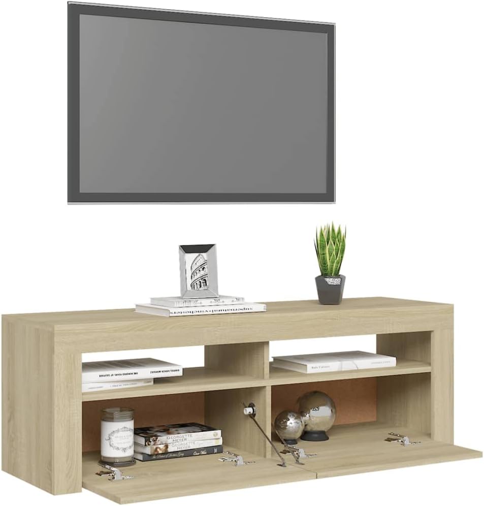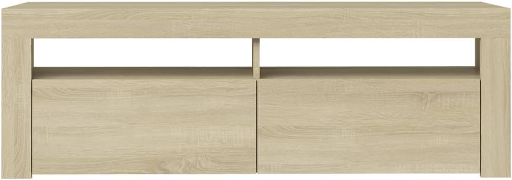 Featuring a trendy yet practical design, this TV cabinet with LED lights will definitely become a focal point of your room.The sturdy construction of this HiFi cabinet makes it highly durable. There is ample space remaining for you to keep your DVD player, game console, streaming device, and media carriers neatly organised. This TV stand features RGB LED lights, which has different menus to change the colour of lights and let the colour adjust automatically differently. The LED lights underline the modern look and contribute to the trendy feeling. Additionally, this TV unit is easy to clean with a damp cloth.Color: Sonoma oakMaterial: ChipboardDimensions: 47.2" x 13.8" x 15.7" (L x W x H)Features RGB LED lightAssembly required: Yes