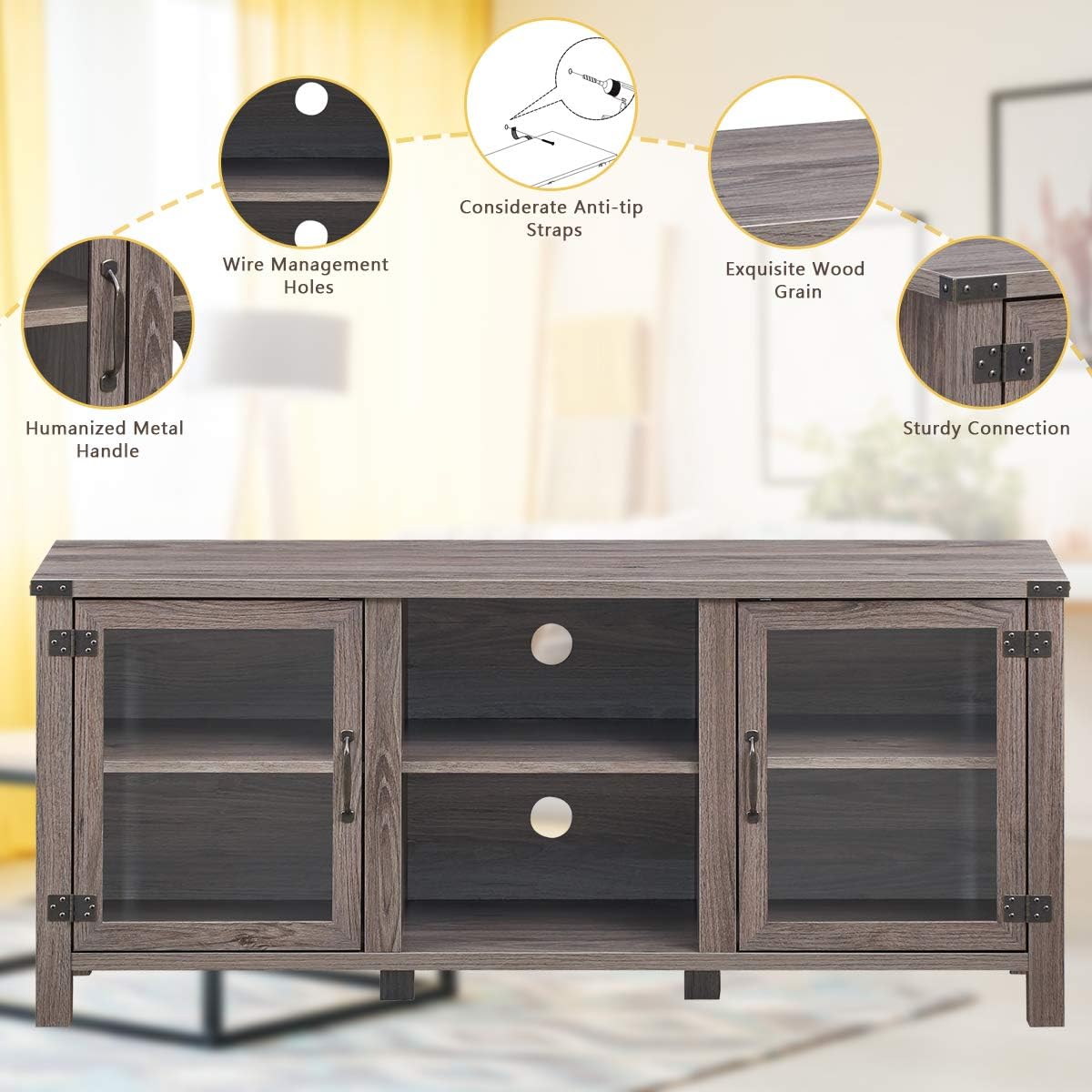 DescriptionOur 57" TV stand is designed to upgrade the space of the entertainment center and add a touch of elegant and glamour to your living space!Crafted of high-quality engineered wood and 6 sturdy legs, this TV cabinet is stable and durable for long-term use. Spacious desktop will fit up to 65" TVs and some decorations. With adjustable design, 2-tier storage shelves and 2 large cabinet can not only offer plenty of space, but also meet the needs of items of different height. What's more, the tempered glass doors is thick, visible and easy to keep clean. With clean line and exquisite appearance, it is suitable for your living room, bedroom, entryway, office and more.FeatureMade of premium engineered wood to ensure sturdiness and durability3-position adjustable design to meet the storage requirements of different height supplies2-tier open shelf to display set-top box and electrical appliance, dissipate heat2 cabinet with tempered glass doors to clearly see the placement of itemsChic and elegant style to integrate into bedroom, living room, office, etcBack anti-tip straps to protect the safety of your familyLarge tabletop to place a 65" TV, plants, photo frame and more6 wooden legs to strengthen its stabilityBack holes to organize messy wiresMax weight capacity can reach 250 lbsSmooth surface for easy cleaningEasy to install under the detailed instructionSpecificationColor: Walnut/ Deep TaupeMaterial: P2 Engineered WoodOverall Dimensions: 57" x 15.5" x 25"(L x W x H)Net Weight: 74.5 lbsWeight Capacity: 250 lbsPackage includes:1 x TV Stand1 x InstructionWhy you choose our TV stand?√With rich textured veneer, it adds an attractive and elegant touch√Compartment with tempered glass door and 2-tier shelves for storing all your items