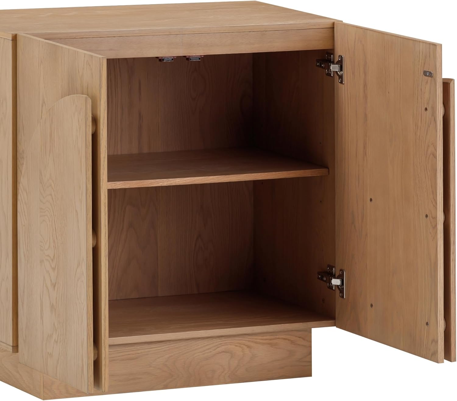 Introducing Iris, an exquisite wooden storage cabinet with a blend of design and practicality. This sideboard buffet features arched corners and rounded-edge silhouette, creating a sophisticated focal point in your living space. Beyond the aesthetics, this wooden accent cabinet is a treasure trove of storage solutions. Discover ample storage space to stow away your essentials, and adjust the interior shelf to accommodate up to 30 lbs of weight, depending on your needs. The Iris mid-century modern sideboard buffet is crafted from high-quality wood, thus brings natural warmth to your home, while also making each one a unique piece due to the natural wood grain. Nathan James is the furniture company built for this generation. You don't need to spend a fortune to get quality design-first furniture and when we say easy assembly, we mean it. Our guarantee is our word. Your purchase is backed by a 100% money-back guarantee. If you have any quality issues just contact us and we will send you a replacement immediately—no questions asked. This product is not recommended for commercial use. Materials: - Rubberwood - Wood Veneer - MDF - Particleboard Assembly Must-Haves: - Scissors - Phillips-head screwdriver - Drill - 1/4" Drill Bit Weight Limit: - Top: 70 lbs - Interior adjustable shelf: 30 lbs - Interior bottom shelf: 50 lbs