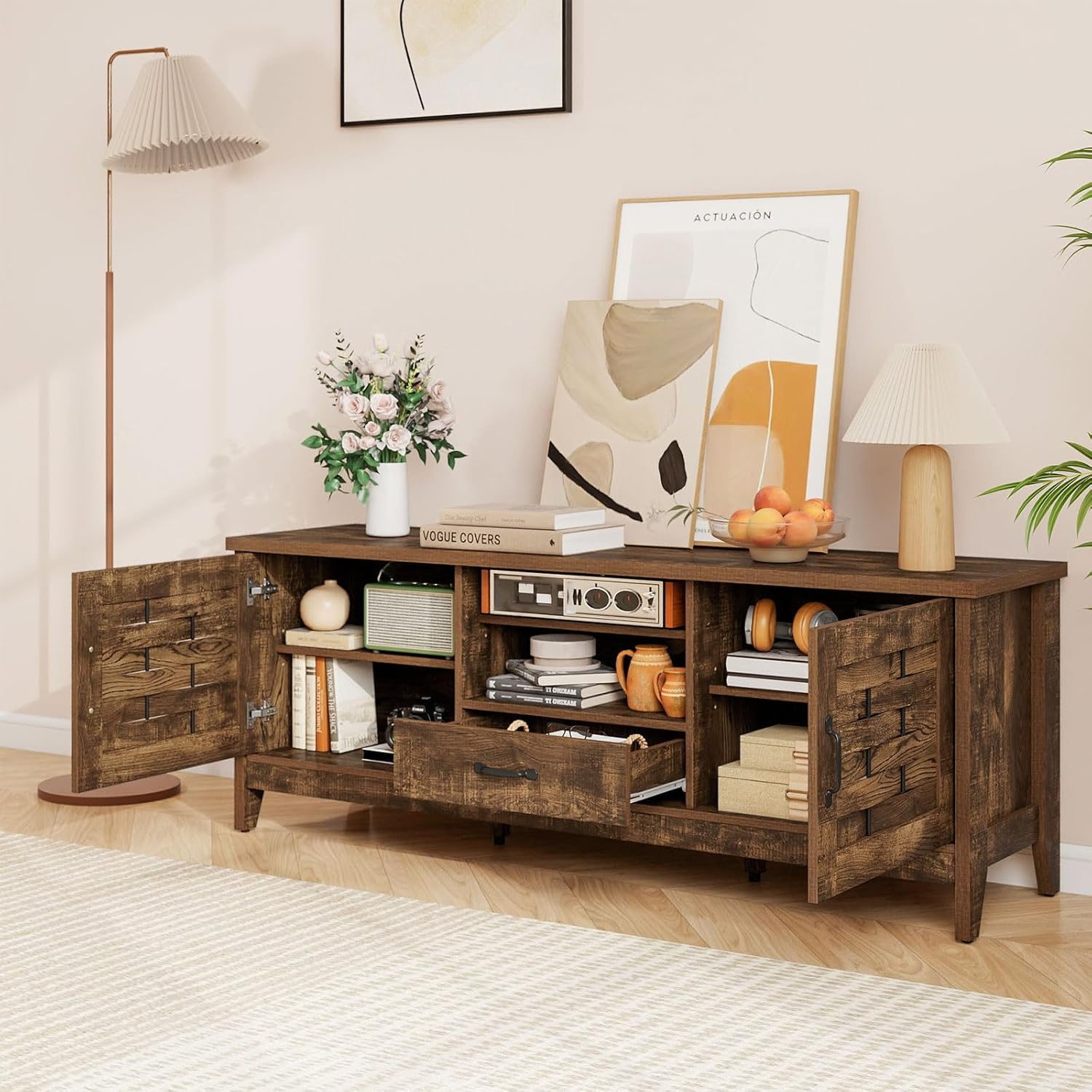 Description:Upgrade your living space with this stylish 59" farmhouse TV stand, designed to hold TVs up to 65 inches and transform any room into an organized entertainment haven. With 3 flexible shelves, roomy cabinets, and a smooth sliding drawer, you’ll have endless options to neatly store consoles, movies, or decorations. Thoughtful details like cable management and extra center support legs provide both a clutter-free look and exceptional stability, holding up to a whole media set with ease. Eye-catching woven cabinet doors combine practicality with rustic charm, making this media console a gorgeous fit for modern homes. Plus, its versatile design means it works just as beautifully as an entryway table or accent piece—perfect for displaying photos, greenery, and more. Effortlessly blending form and function, this console will quickly become the focal point of your space!Features:With 3 flexible shelves, a drawer and 2 cabinets to provide ample storage spaceEach with 3 adjustable positions and can be removed for customized storageHolds a 32"/43"/55"/65" TV, books, game consoles and decorations2 built-in cable holes help to lead the cords and prevent tanglesSturdy 6-point support prevent the long console table from sagging2 additional center legs are fitted with adjustable foot pads for added stabilityImpressive farmhouse TV stand with elegant woven texture for an airy lookSmooth surface for easy maintenanceAssembly neededSpecification:Color: Rustic Brown/Rustic OakMaterial: Engineered Wood, MDFOverall Dimensions: 59" x 15.5" x 22" (L x W x H)Inside Dimensions of Cabinet: 17.5" x 14" x 15" (W x D x H)Dimensions of Adjustable Shelf: 17.5" x 12" (W x D)Height of Open Compartment (without Shelf): 9.5"Inside Dimensions of Drawer: 15.5" x 11" x 3" (W x D x H)Off-ground Clearance: 3.5"Weight Capacity of Tabletop: 110 lbsWeight Capacity of Shelf: 22 lbsWeight Capacity of Drawer: 11 lbsNet Weight: 71 lbsPackage Includes:1 x TV Stand1 x User Manual