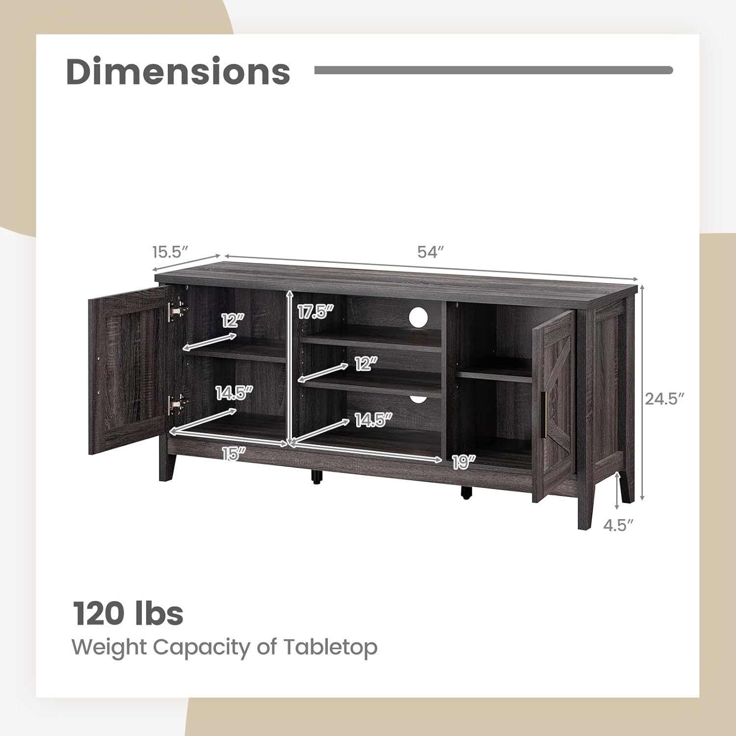 Description:Upgrade your living space with this farmhouse TV stand!The spacious top holds TVs up to 65 inches, while 2 enclosed cabinets and a center section with adjustable shelves offer abundant, customizable storage for your essentials. Supported by 6 sturdy legs, including 2 central rubber wood legs with adjustable foot pads, this media console cabinet ensures reliable support and greater stability. Additionally, it is equipped with 2 cable management holes, keeping wires neatly organized. With its rustic barn doors and rich wood-grain finish, this entertainment center adds timeless farmhouse charm to your living room or bedroom.Features:Spacious top fits TVs up to 65 inches comfortably 2 enclosed cabinets with 3-position adjustable shelf Middle open compartments feature two 7-position adjustable shelves Rustic farmhouse style with charming barn-inspired doors Wood-grain finish is scratch-resistant and easy-to-cleanRaised support legs offer 4.5” enough clearance for cleaningExtra support legs with adjustable foot pads for enhanced stability Premium metal hinges ensure smooth door operation 2 cable management holes keep wires neat and tidy Convenient metal handles provide a comfortable grip Assembly is required before useSpecifications:Color: Gray Material: Engineered Wood, Rubber WoodOverall Dimensions: 54” x 15.5” x 24.5”(L x W x H)Dimensions of Middle Shelf in the Cabinet: 15” x 12”(L x D)Dimensions of Bottom Shelf in the Cabinet: 15” x 14.5”(L x D)Dimensions of Compartment: 19” x 14.5”(L x D)Height of Door: 17.5”Raised Height: 4.5”Net Weight: 66 lbsWeight Capacity of Tabletop: 120 lbsWeight Capacity of Each Shelf: 22 lbsPackage Includes:1 x TV Stand1 x User Guide