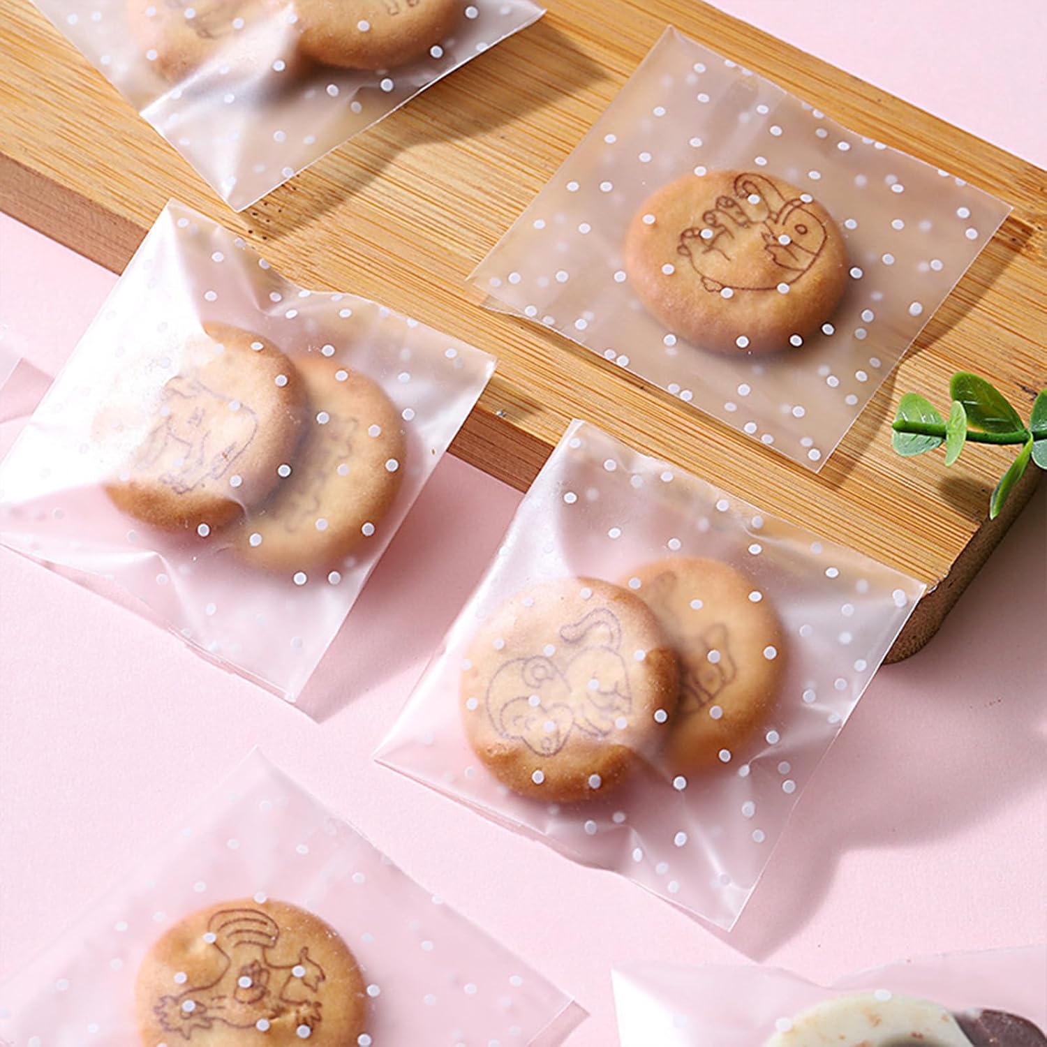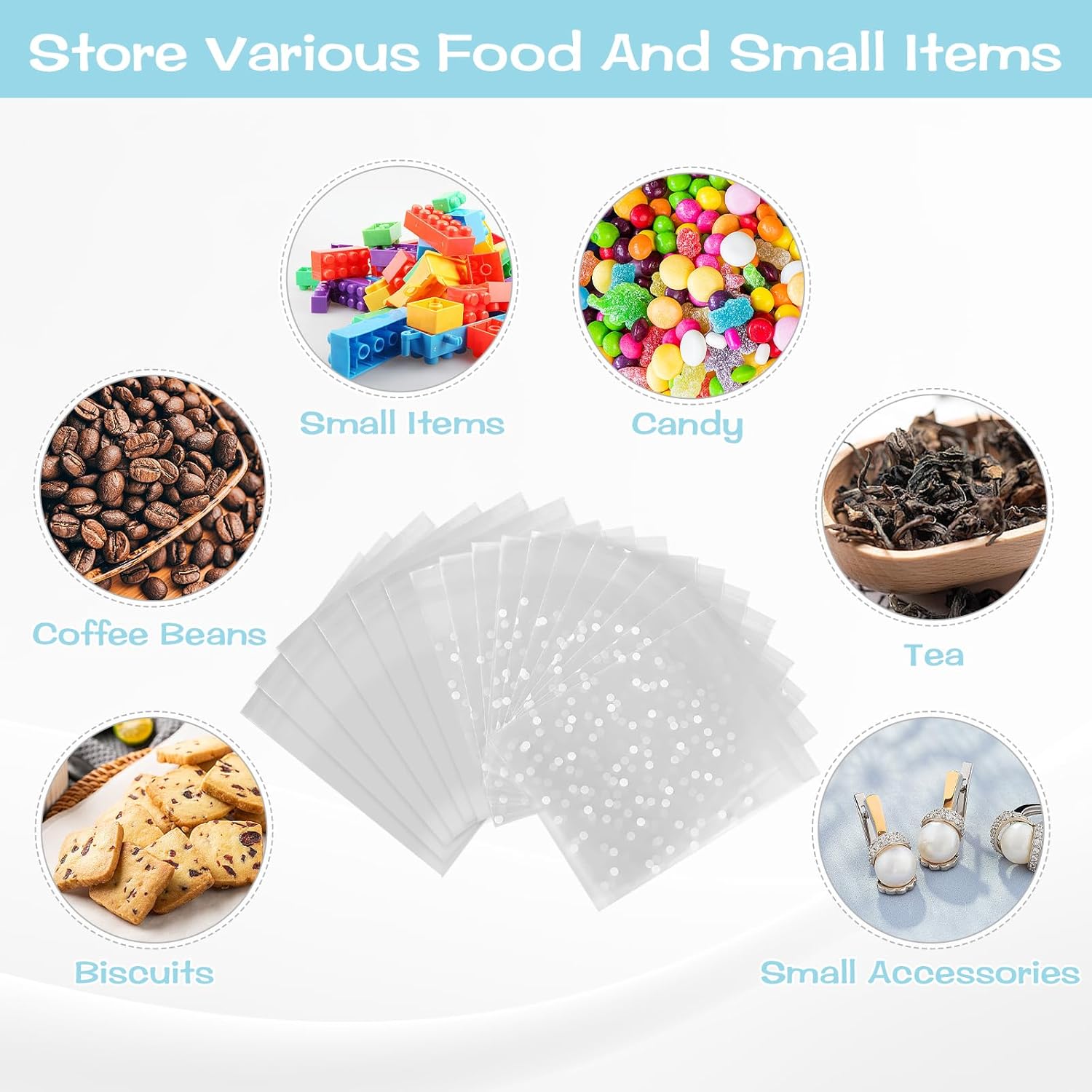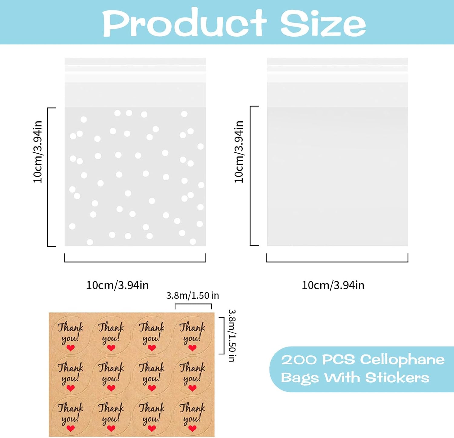 Resealable Clear Cellophane Bags, Cookie Bags Cellophane, Self Seal Cellophane BagsSpecifications:Material: PVCColor: ClearSize: 10 x 10 cm/3.94 x 3.93 in3.8 x 3.8 cm/1.50 x 1.50 inPackage includes:100 x Dot cookie bags100 x Frosted cookie bags216 x Thank you stickers