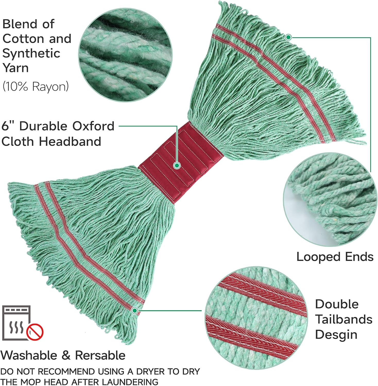 High-quality cleaning with the ONESIMUS Industrial Commercial Grade Cleaning Loop-End Mop,designed for restaurants,offices,Warehouse and hotels use.This heavy-duty mop head efficiently tackles dirt and grime to maintain a clean, sanitary environment in your restaurant, hotel, office, or home. Durable and Reliable Crafted from durable cotton and rayon, can offers exceptional water absorption.This mop is built to withstand tough messes, providing long-lasting performance.Its classic design offers a dependable solution for hassle-free cleaning. Efficient Cleaning The 6'' oxford cloth headband,2 of 6 inch tailband and loop-end construction allow for a wider cleaning path, saving you time by covering more surface area with each pass,also provide a long product life.This feature can reduces tangling,fraying,and unraveling,making it perfect for mopping floors or cleaning up spills. Compatible Design The 6'' oxford cloth headband mop head is ideal for use with jaw clip mop handles and side gate handles (sold separately).Check out our other listings for matching mop handles to complete your cleaning setup.