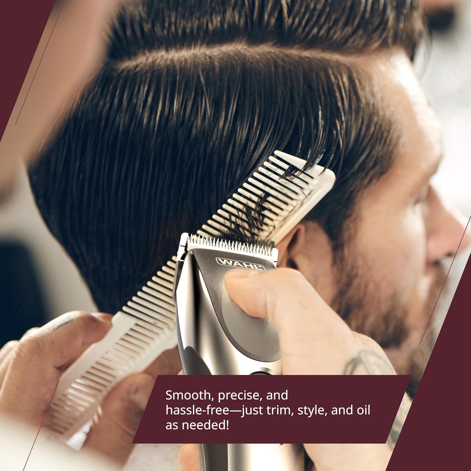 Wahl® Cord/Cordless Home Barber Kit. Under Brian Wahl`s leadership, the company sets its sights on leading with vision, a new philosophy for the 21st Century. CLIPPER: Cord or cordless- flexible use with or without cord. Self-sharpening precision ground blades stay sharp longer. Powerful, long-lasting motor for smooth & easy haircuts. Easy-clean detachable blades. DETAIL TRIMMER: Clean up necklines, touch-up sideburns and trim around the ears. EAR, NOSE & BROW TRIMMER: Personal trimmer with 2 interchangeable heads. Removes unwanted hair without nicking or pulling.