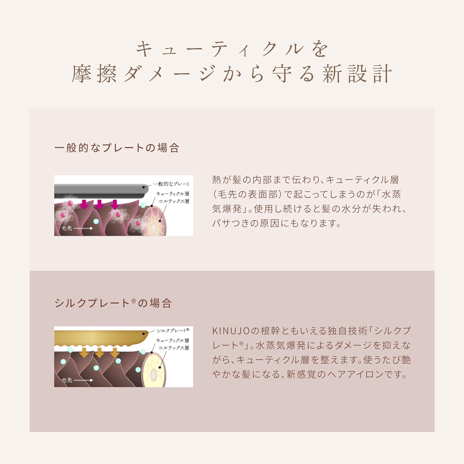 KINUJO W-worldwide model- hair iron straightener. KINUJO is a hair straightener regularly used by 20,000 beauticians. The new addition of this popular brand is for the use at home and overseas. One of the features includes the Silk Plate, which minimizes the moisture evaporation from your hair. It also quickly heats up to your desired temperature, and you can use it right after turning it on. This model can be used with voltage in foreign countries, so you can take it for your next trip abroad.