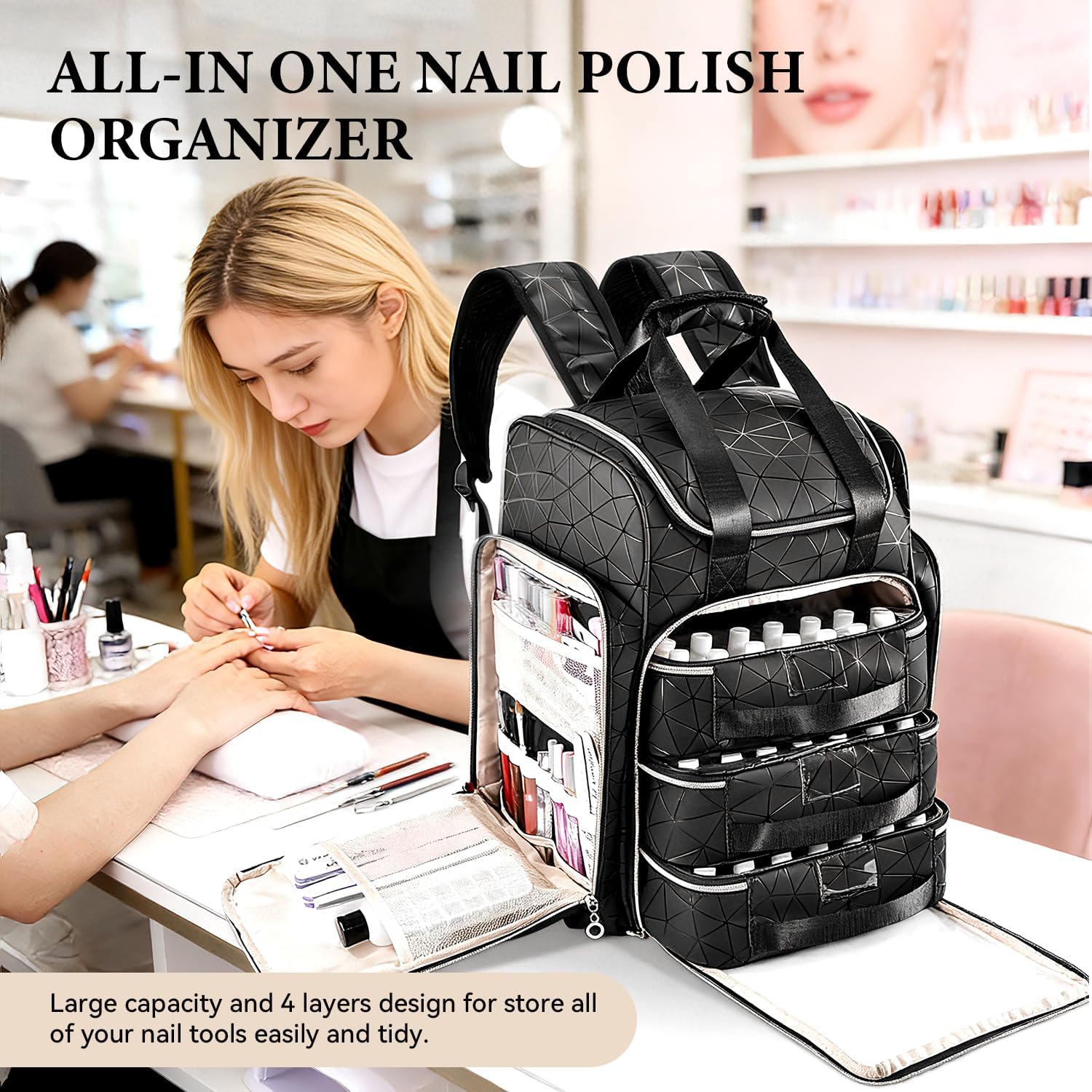 JEWHITENY Extra Large PU Nail Polish Organizer: Holds 126 Bottles (15ml), Nail Kit Store Bag with 3 Removable Case,Shoulder straps, Handle, Luggage Straps,Portable Nail Storage Travel Bag for Nail Pro