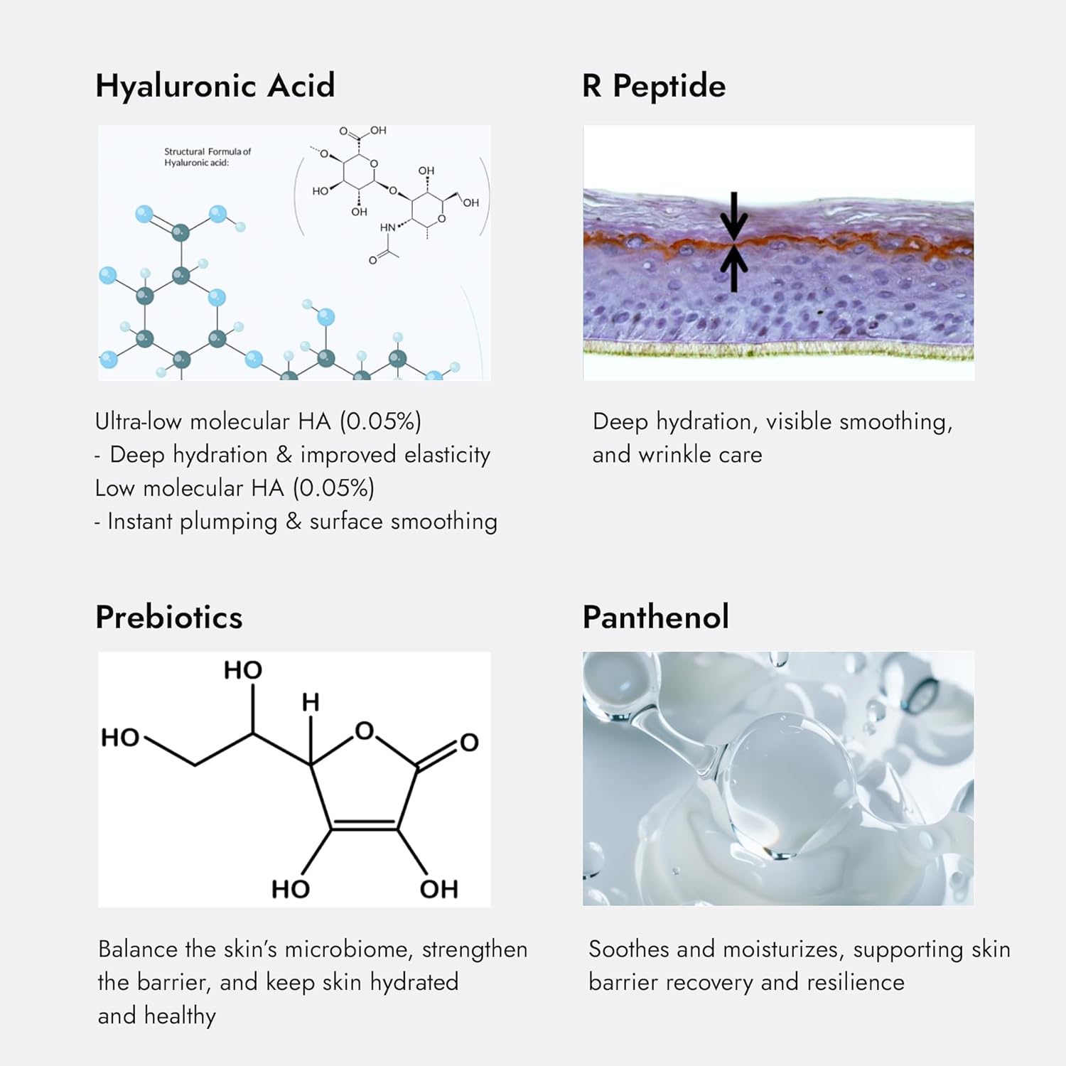 | Special Ingredients | Hyaluronic Acid, Panthenol, Peptide, Prebiotics |