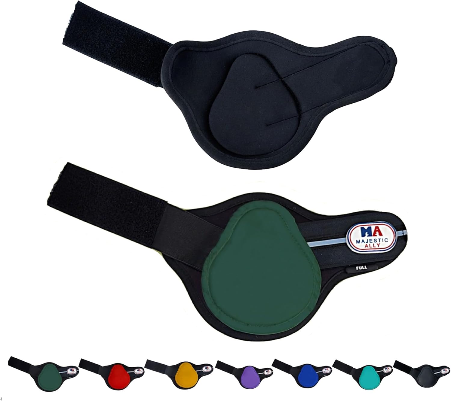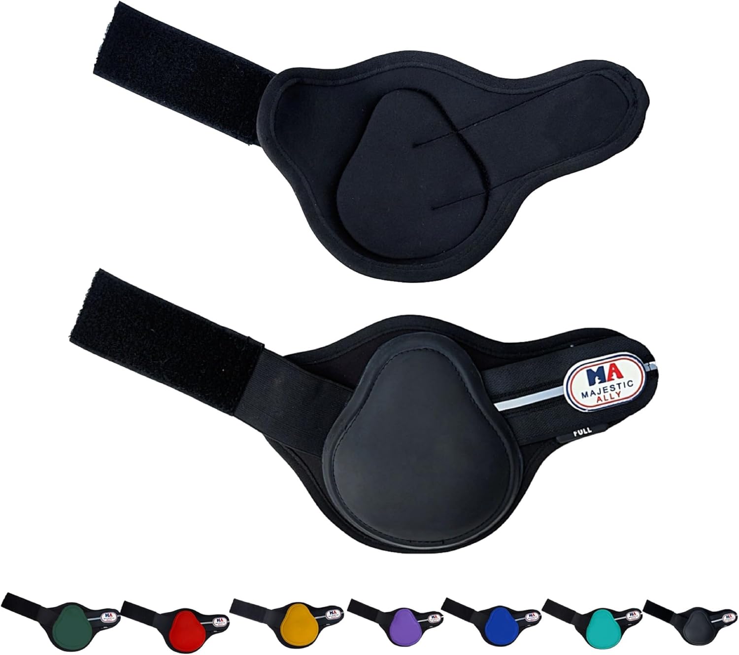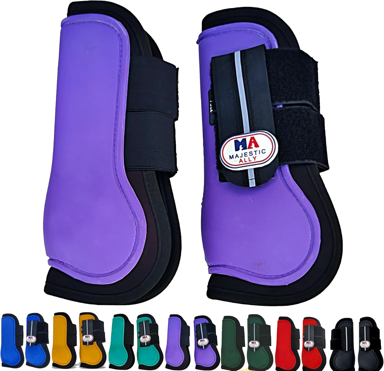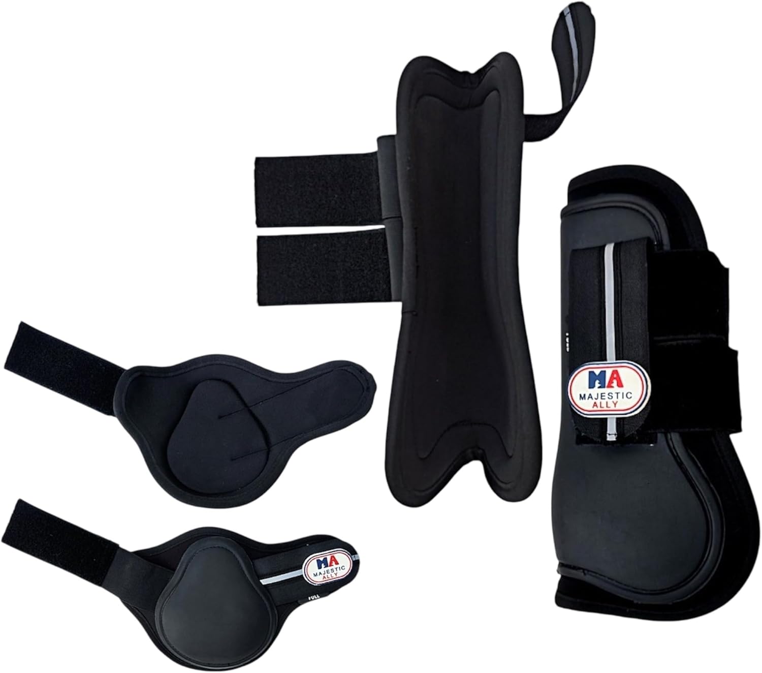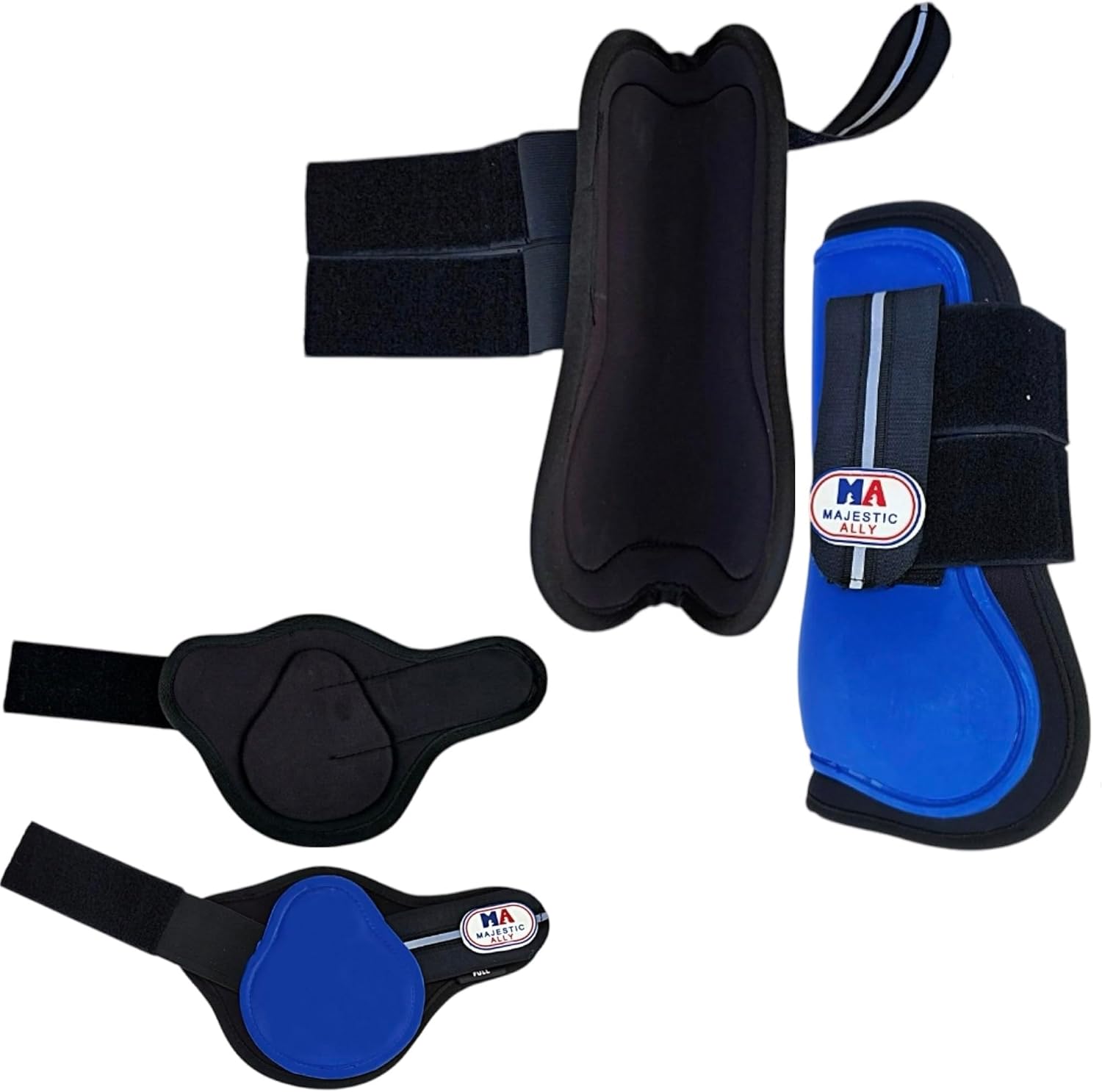 Protect your horse's legs with the Majestic Ally Pair of rear Horse Fetlock Boot and Pair of Front Tendon Boot. This set offers durable leg protection with a PU shell outer and soft neoprene lining for comfort. Strong hook and loop closures ensure a secure fit on your horse's legs. These boots are available in multiple colors and sizes, and can be purchased separately as a pair of Tendon boot or Fetlock boot or both pair together . Safeguard your equine partner's legs during riding or training sessions with this high-quality leg protection gear.
