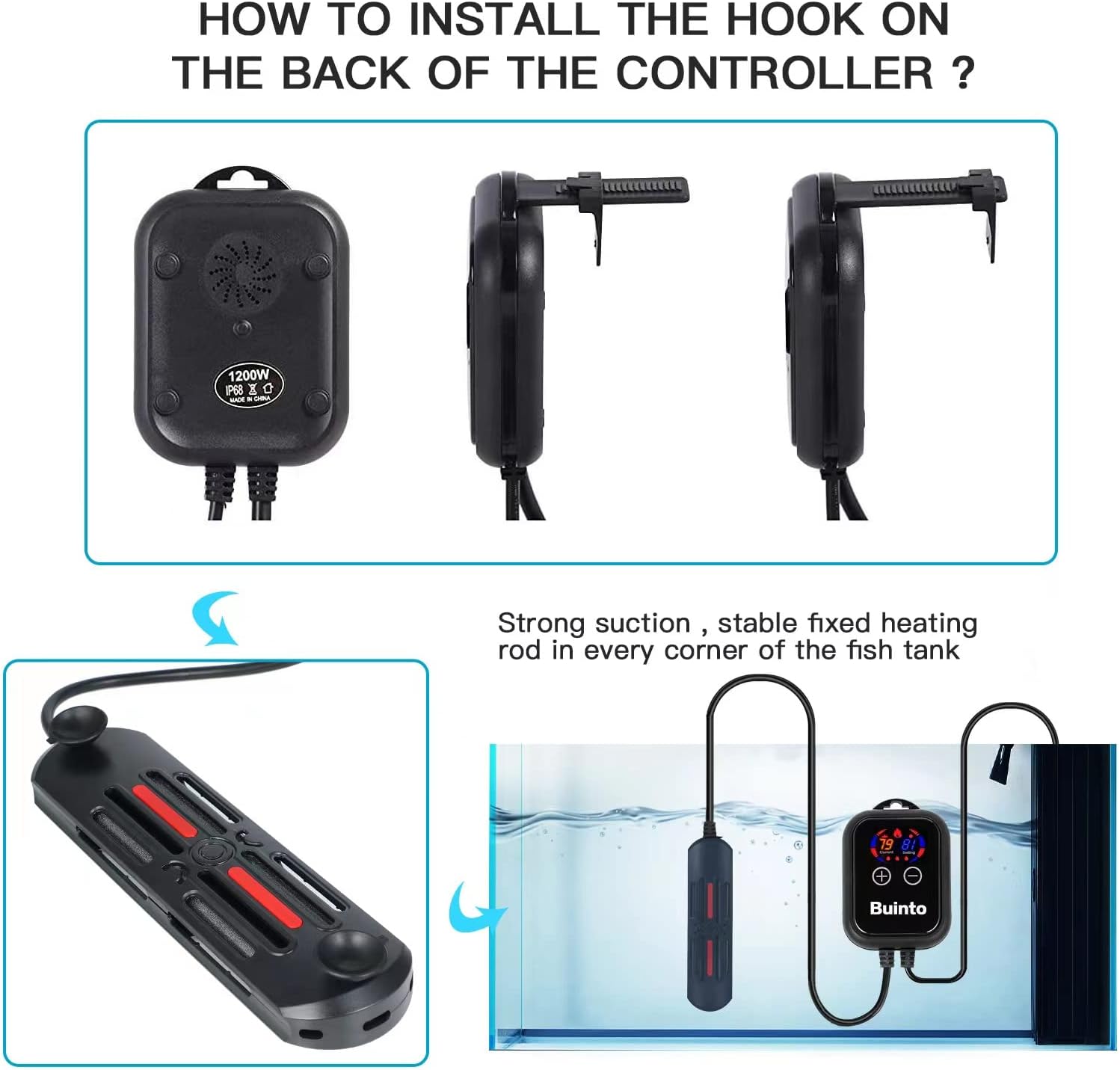 Welcome to Buinto. Buinto is a shop specializing in the sale of aquarium heaters. We are committed to providing customers with quality products and better service. We provide 24-hour customer service, covering pre-sale and after-sale service. If you have any questions, please feel free to contact us. Product Name: Buinto Aquarium Submersible Heater Specifications: 1200W [VOLTAGE]: 110V / 60Hz [Product Size]1200w:12.4in*3.1in [Power cord length]: 4ft+6ft 【PACKING LIST】: 1 × heater with external controller; 1 × user manual; 4 suction cups Why choose a Buinto aquarium heater? 1. Safe to use. The digital aquarium heater will automatically turn off when the water temperature exceeds 93℉. 2. The heating element is high-quality explosion-proof double quartz tube, high temperature resistant and environmentally friendly PC plastic protective cover, suitable for fresh water and salt water. 3. Compared with traditional aquarium heaters, the built-in PID smart chip can save energy up to 30%. 4. The high-definition LED digital display on the controller shows the set temperature and real-time temperature. Easily set the temperature by touching the + and - buttons on the controller. Control temperature range 59°F to 93°F. Temperature Accuracy: ±1°F (The controller is not waterproof. Can't touch water) [WARM TIPS] When using the heater, in order to make the temperature of the fish tank uniform, be sure to use it with the circulating water pump. It is better to install the heater in a place with rapid water flow. [QUALITY GUARANTEE] This product has a one-year warranty. In the process of using the product, if you have any dissatisfaction, please contact our after-sales service to solve it for you.I wish you a happy shopping.